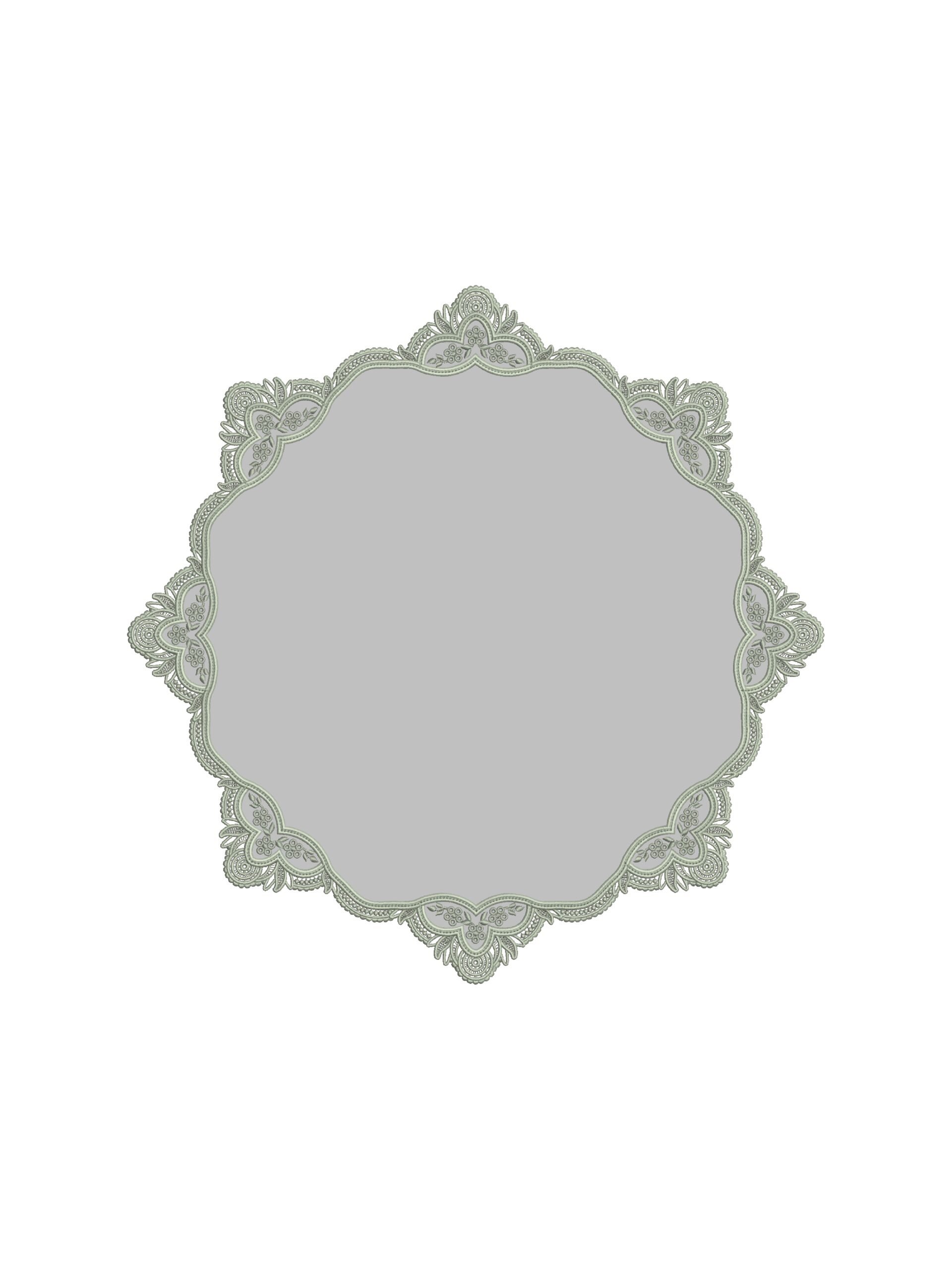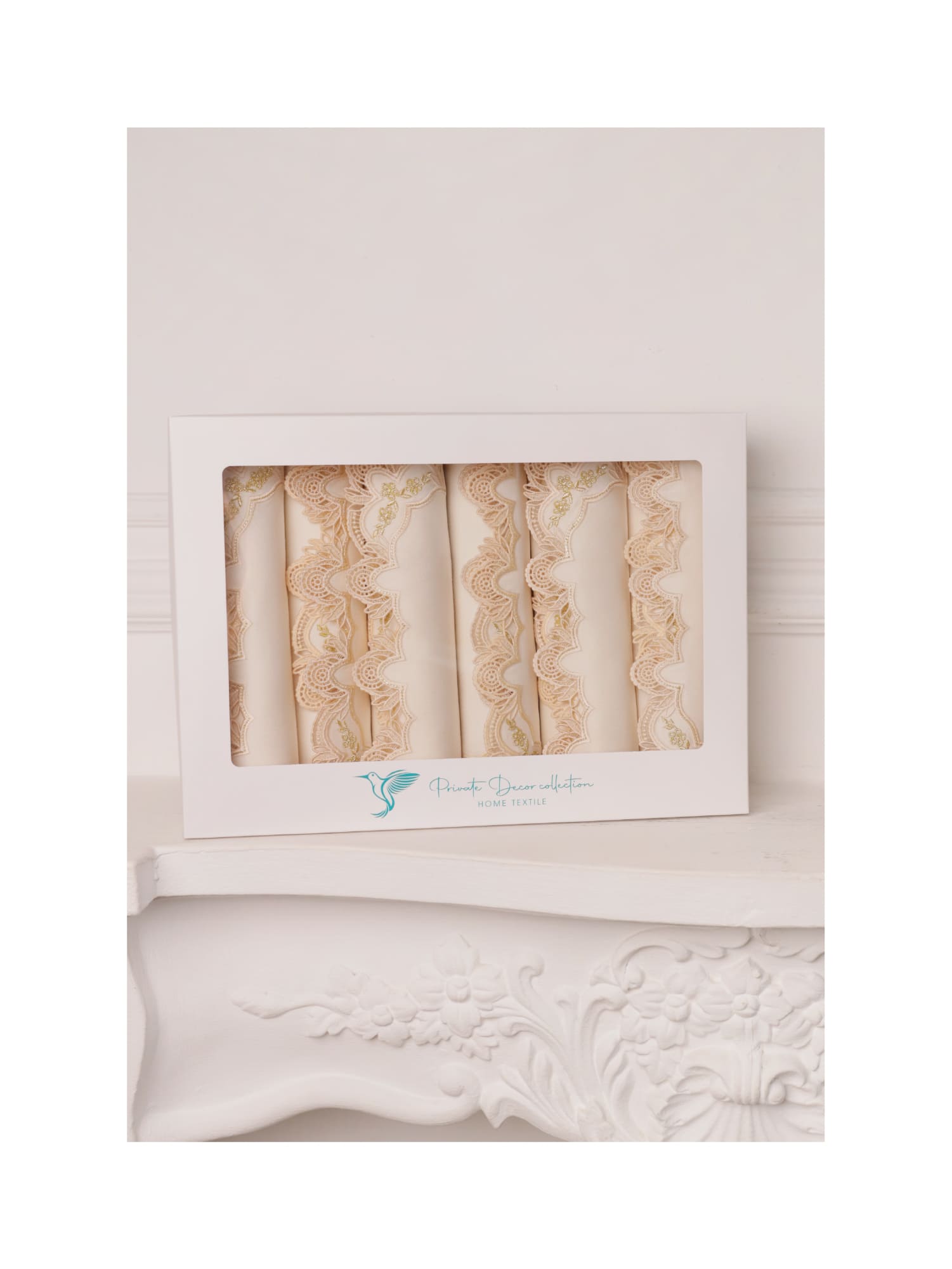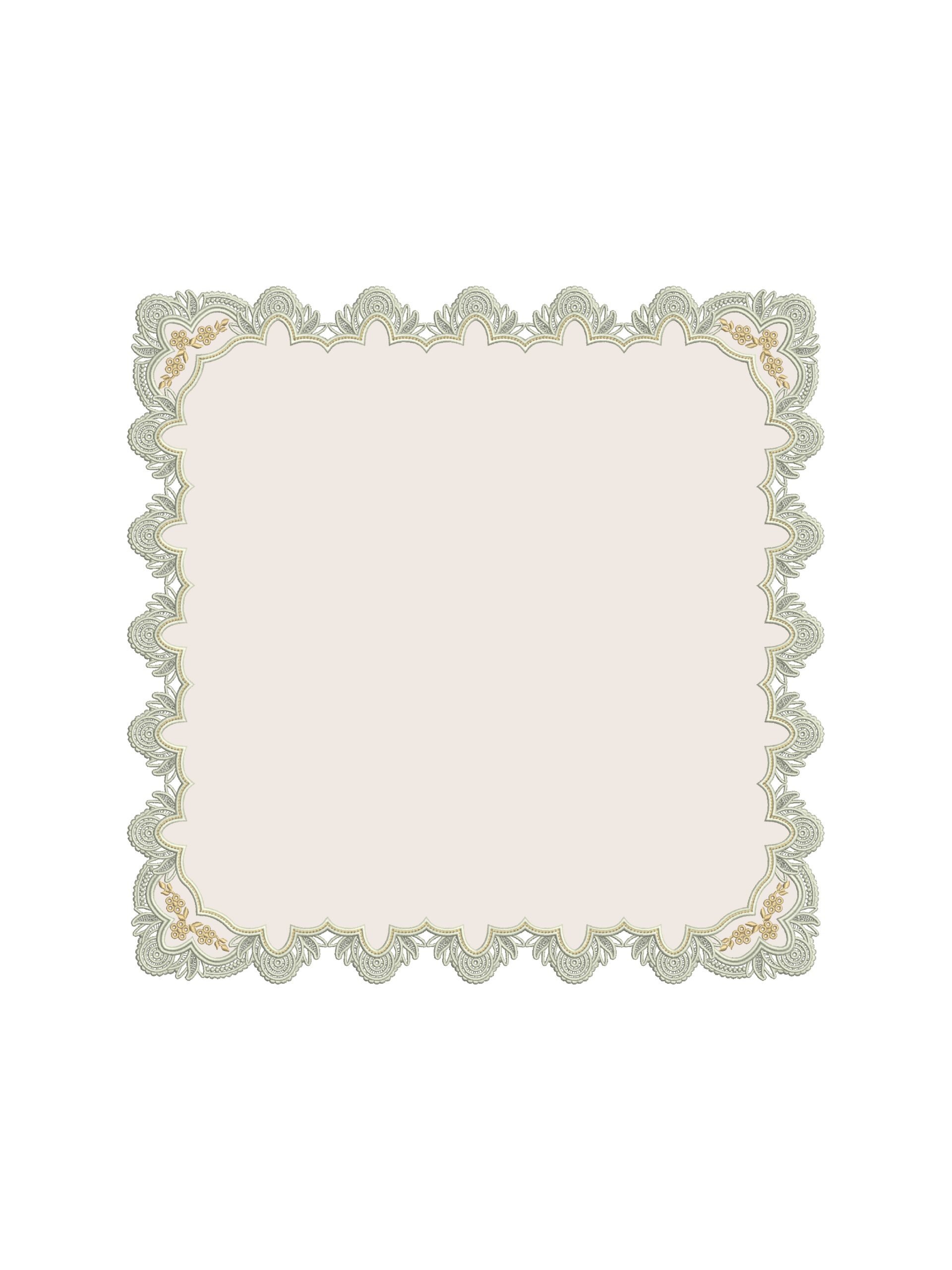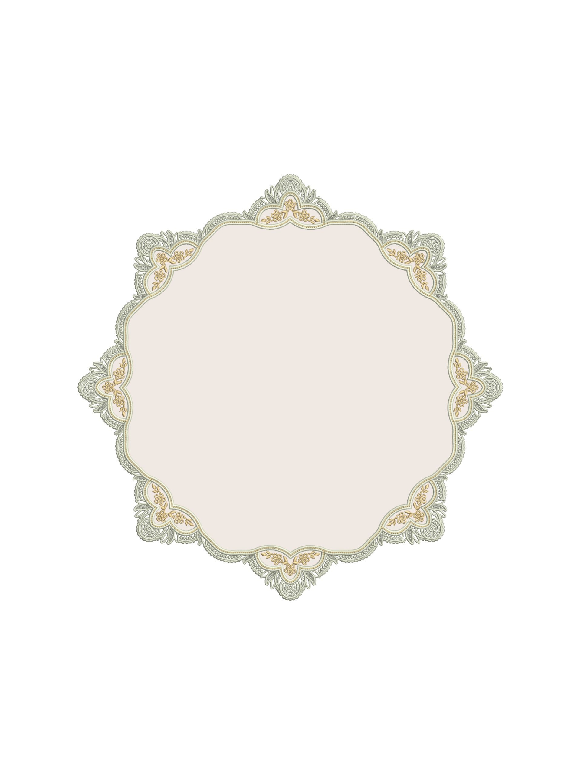 Ажурный край, выполненный в технике ришелье, формирует изящный силуэт, напоминающий тонкие воротнички старинных придворных нарядов. Его плавные линии и вырезные элементы создают эффект лёгкого кружева, который мягко очерчивает форму салфеток и плейсматов.