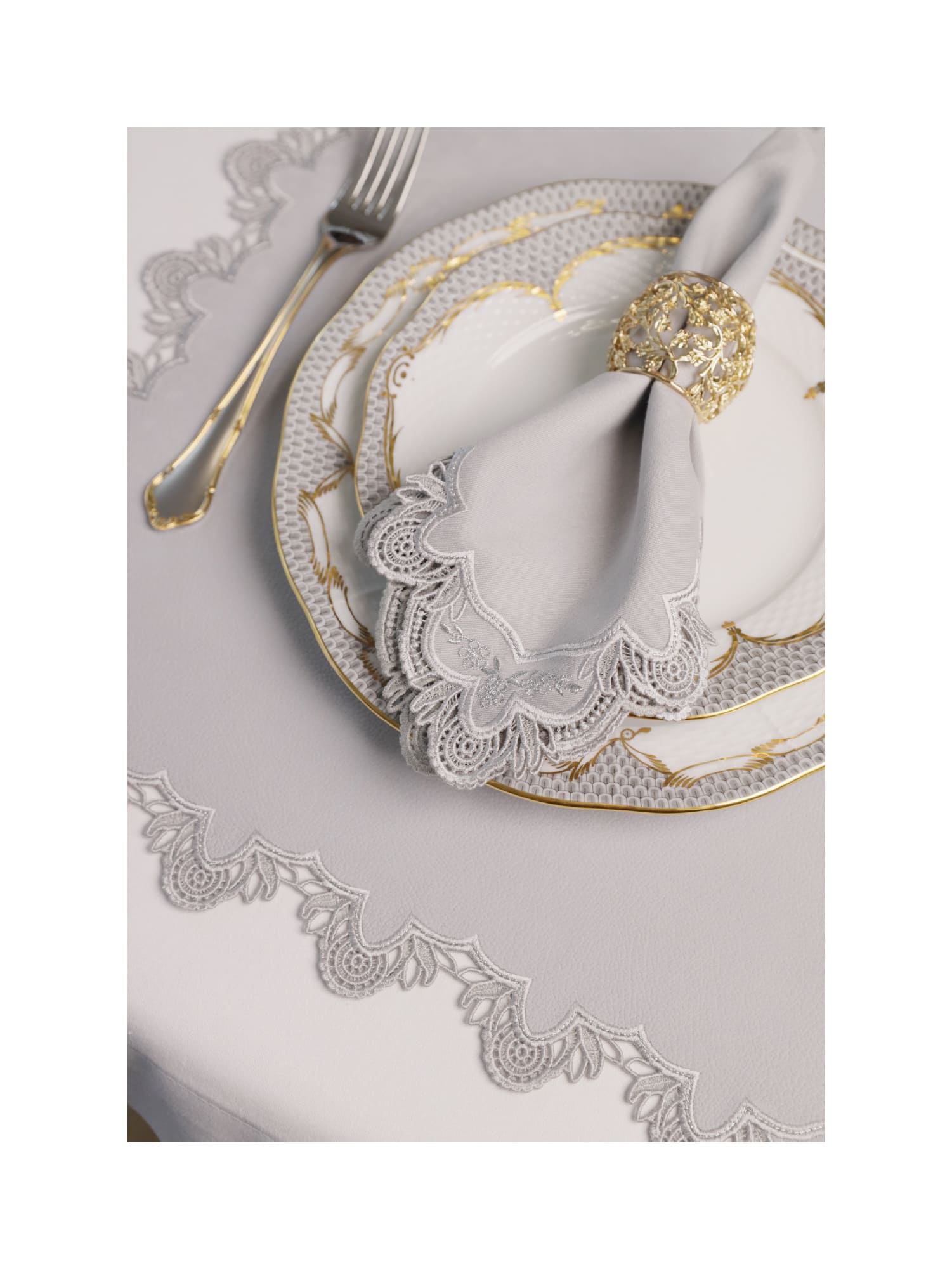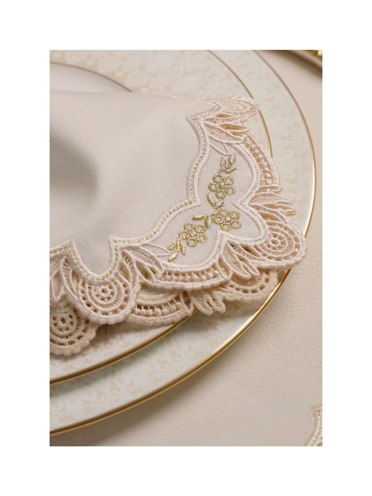 Флористические мотивы в орнаменте вписаны деликатно: округлые лепестки, аккуратные завитки и небольшие «окна» ришелье придают узору утончённость и визуальную глубину. Он не перегружает сервировку, а добавляет ей аристократичной мягкости — такой, которая ощущается скорее в атмосфере, чем в деталях.
