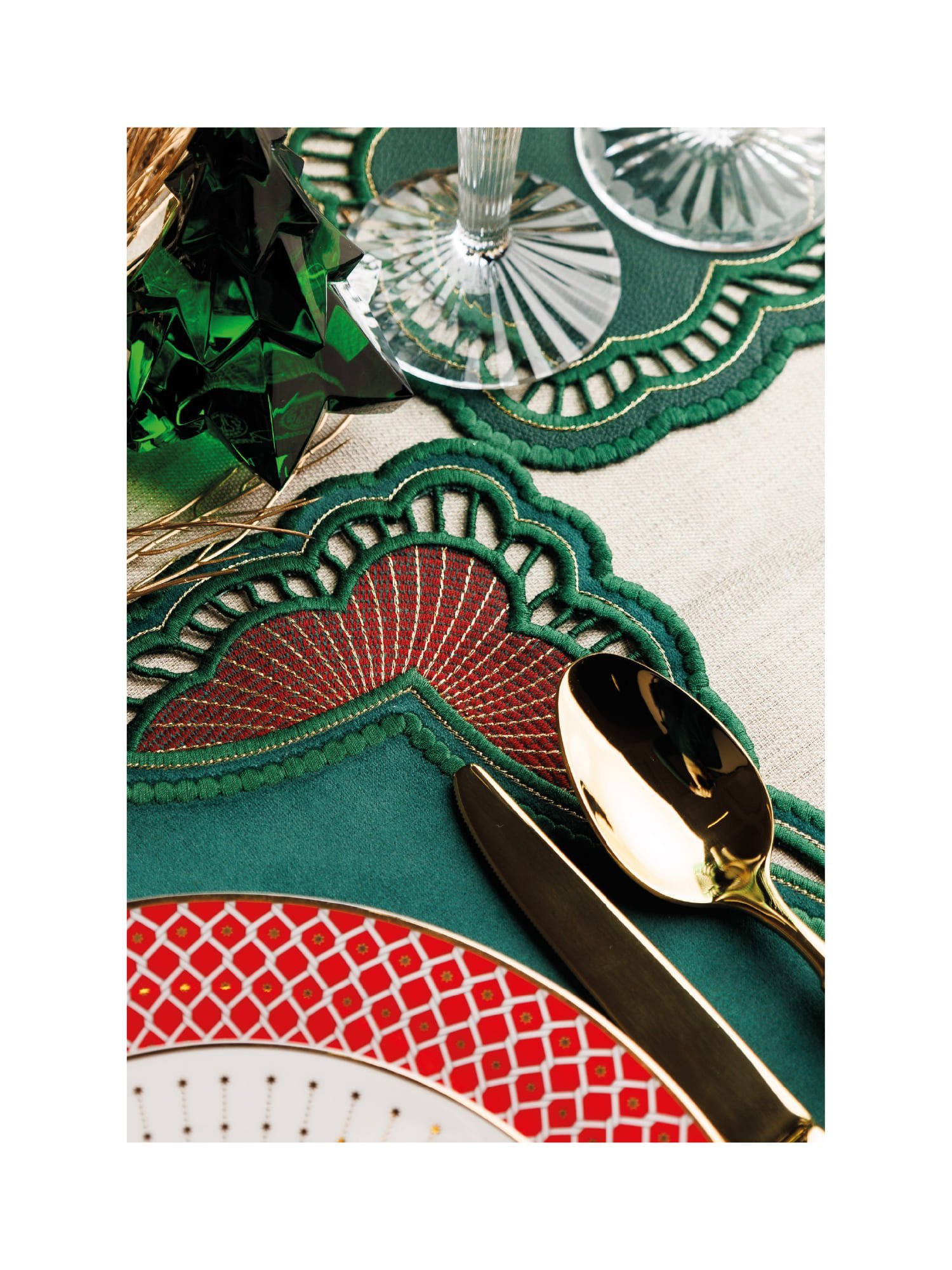 Графичные линии, аккуратный рельеф и лучевая вышивка создают эффект праздничного сияния — будто отражения ёлочных огней ложатся на ткань и оживляют каждый элемент сервировки. В этой коллекции чувствуется дыхание классического зимнего праздника: торжественного, насыщенного деталями, наполненного ожиданием чуда.