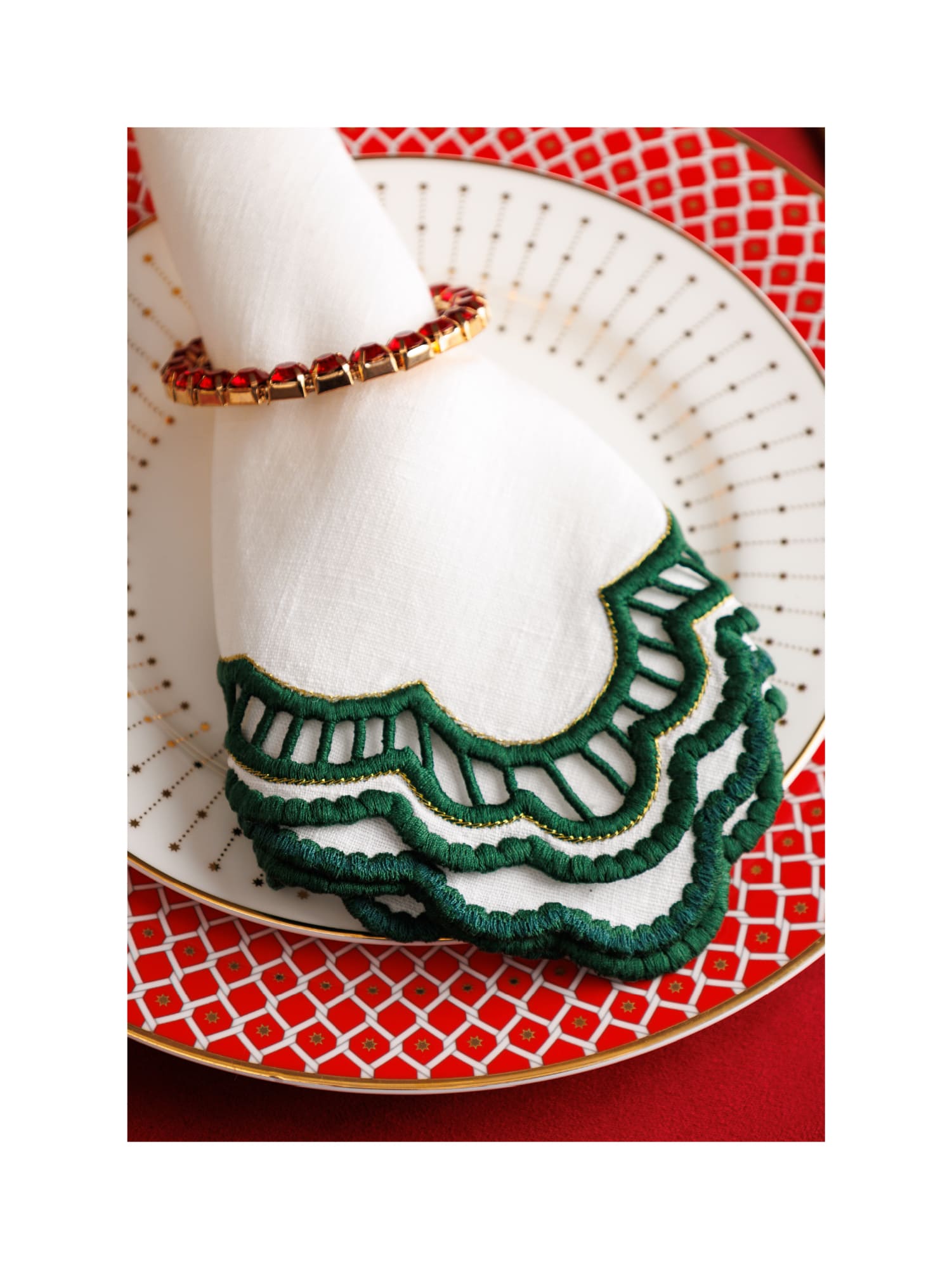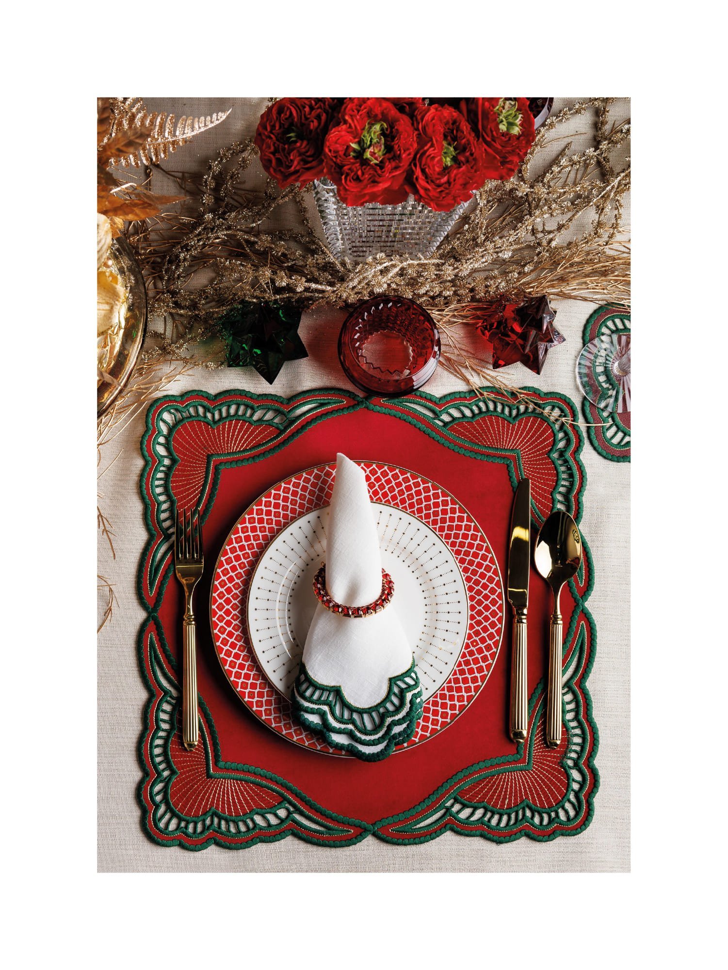 L’Opera — праздничная коллекция, в которой новогодний декор звучит так же торжественно, как вступление к зимнему спектаклю. Многослойный волнистый край и тонкая прорезная вышивка отсылают к театральным занавесам и рождественским постановкам, где свет софитов играет на бархатных драпировках и золоте декора.