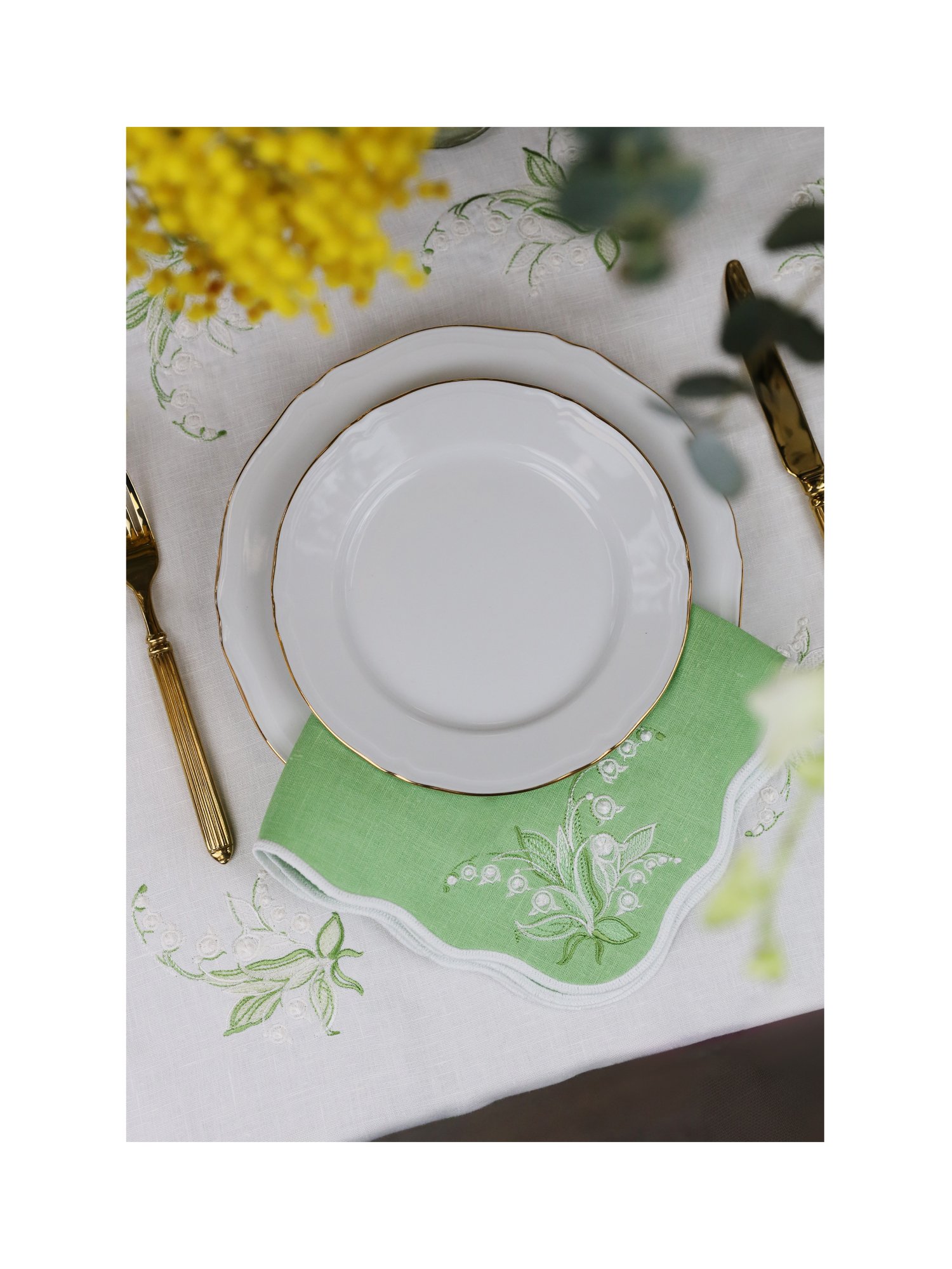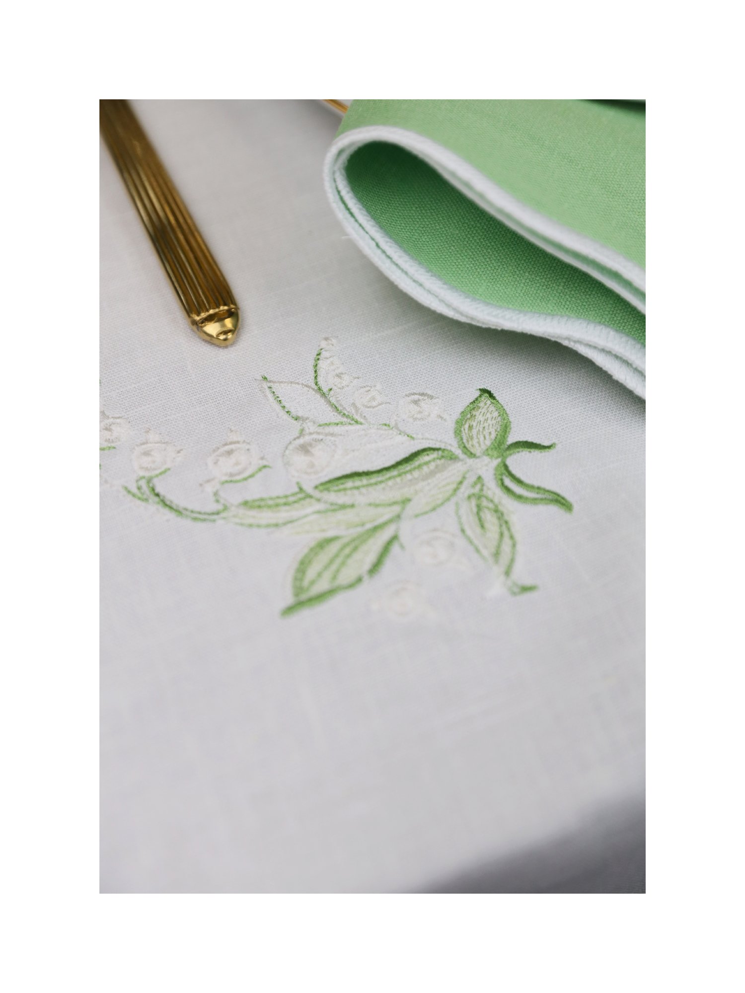 Коллекция Lilies of the valley вдохновлена утончённой красотой ландышей — символа чистоты, нежности и пробуждения весны. На изделиях расцветают изящные вышитые веточки с крошечными колокольчиками, которые обрамляют край мягким и изысканным орнаментом. Тонкие линии и гармоничные детали придают композиции воздушность и лёгкость, создавая ощущение утончённой природной гармонии.