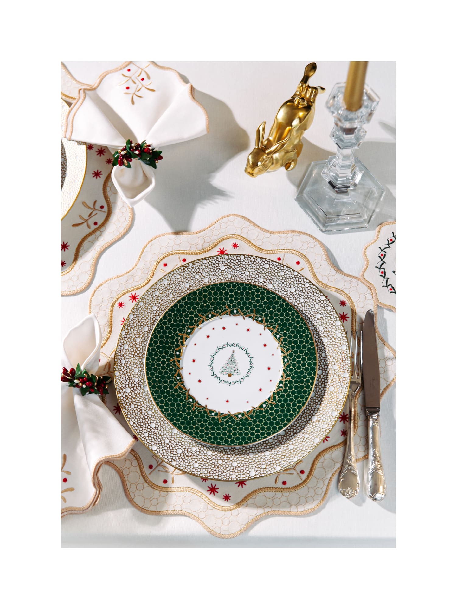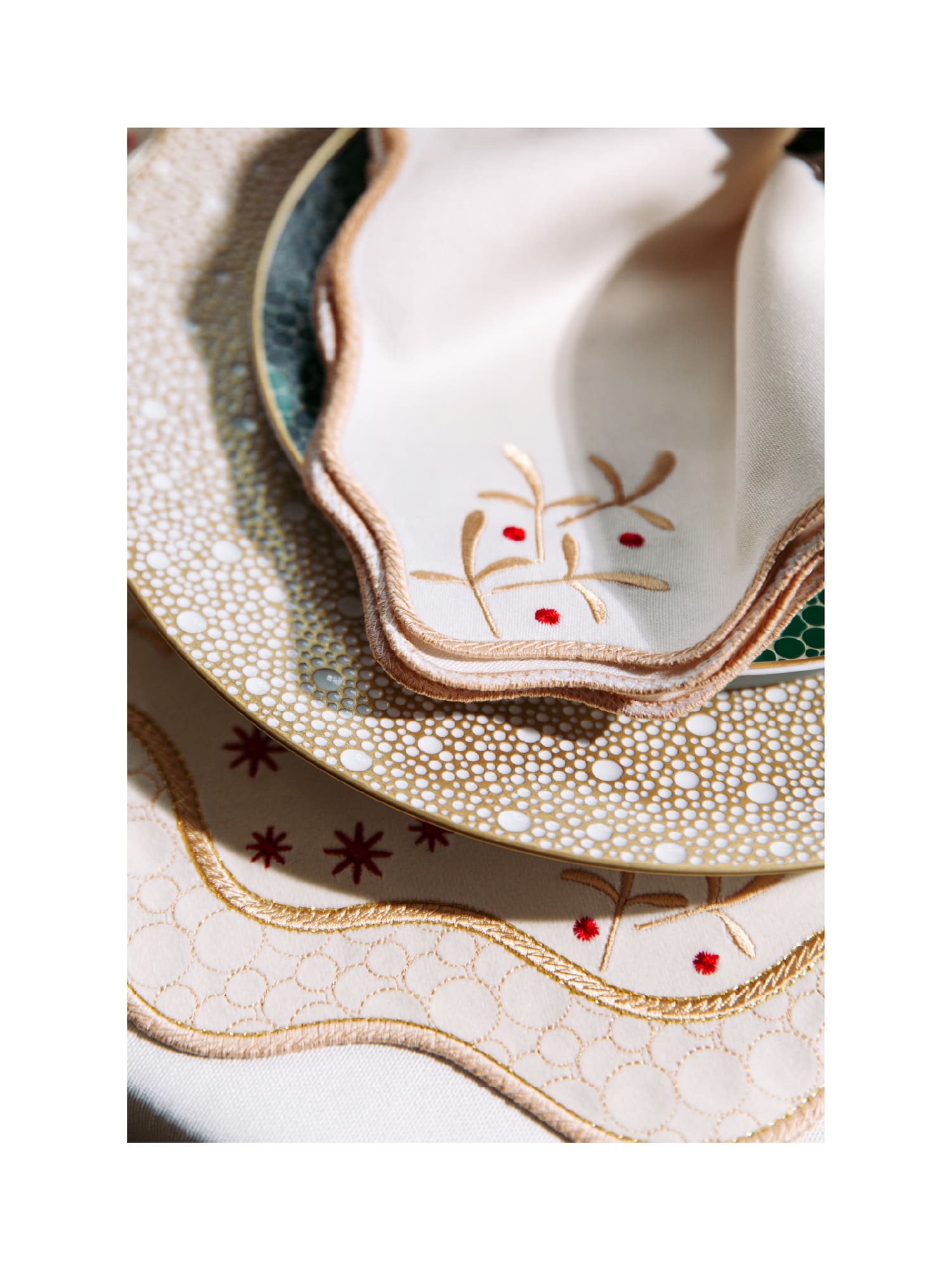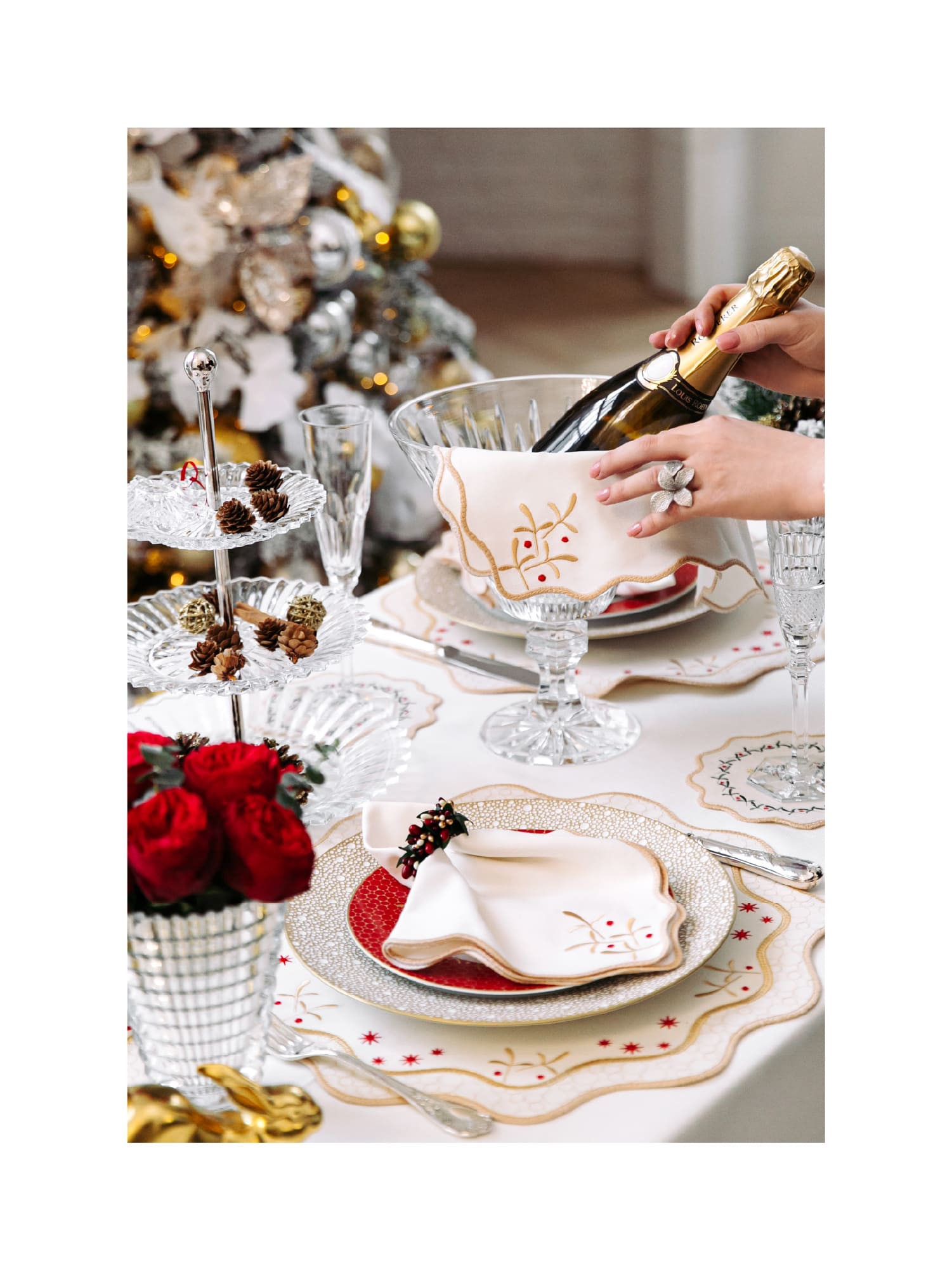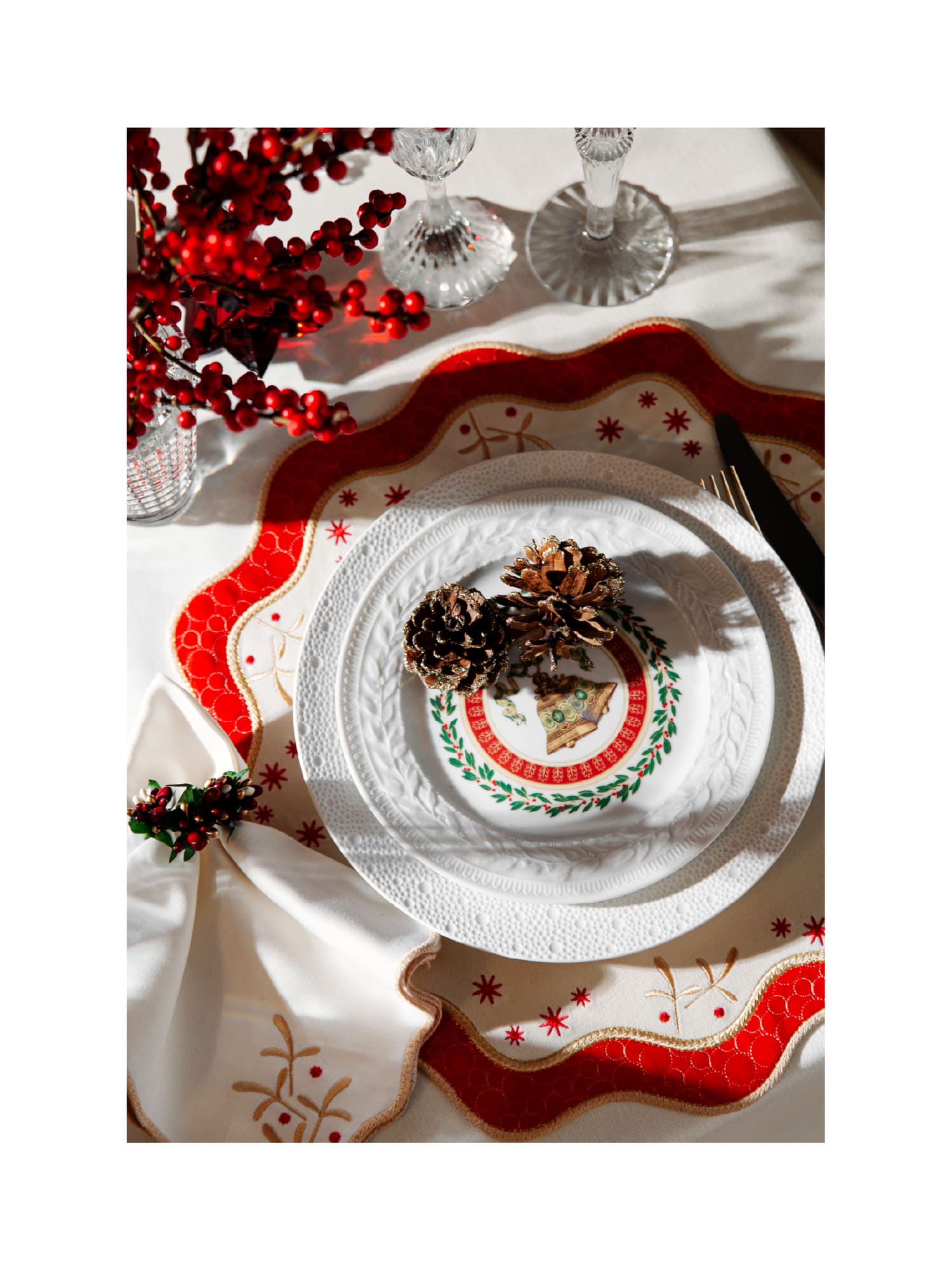 Орнамент коллекции разработан в эстетике, вдохновлённой культовой рождественской посудой Bernardaud Noël: те же мотивы зимней сказочности, внимание к деталям и тонкая праздничная символика. Благодаря этому текстиль становится гармоничным продолжением сервировки и подчёркивает атмосферу торжества.