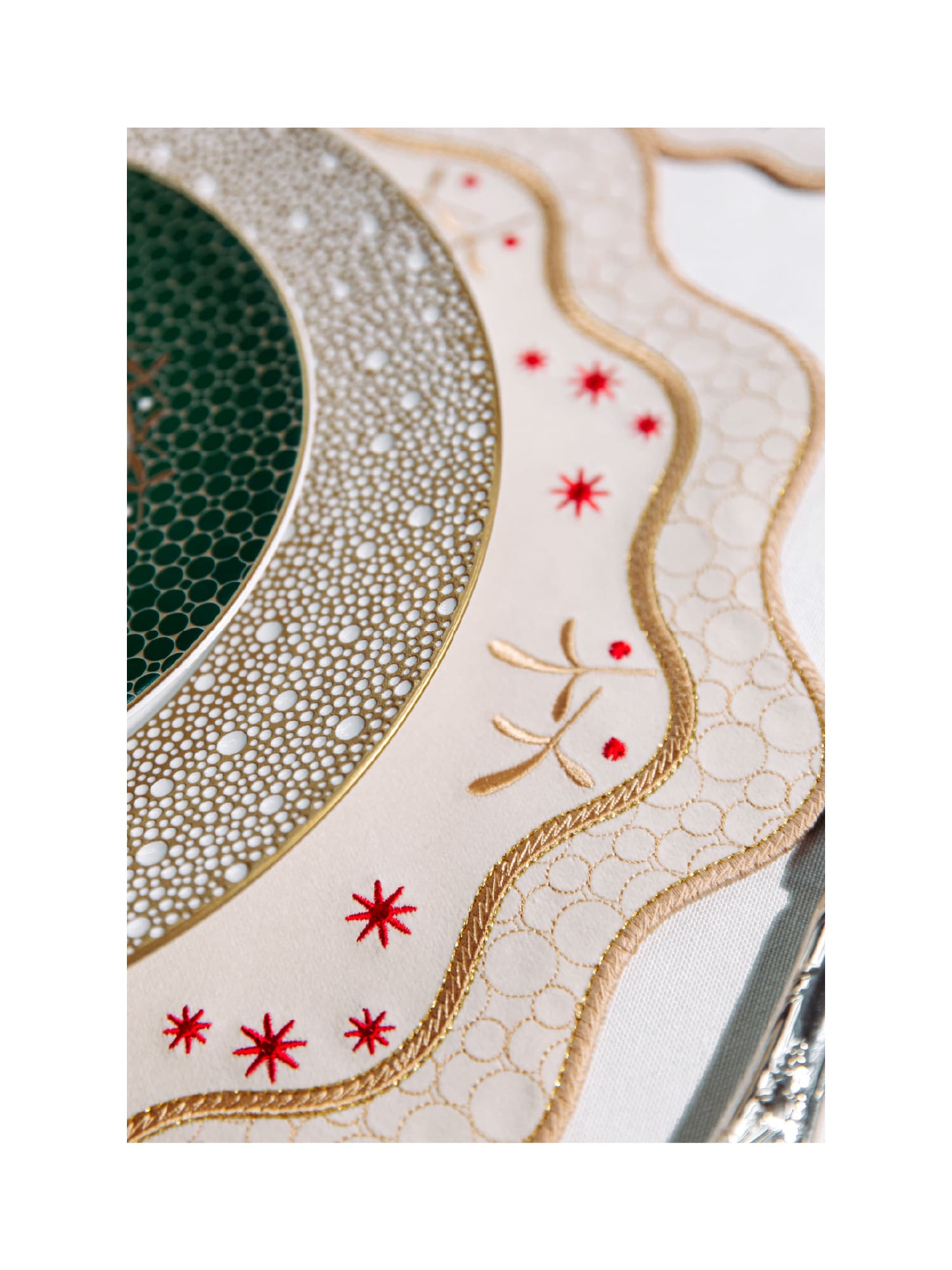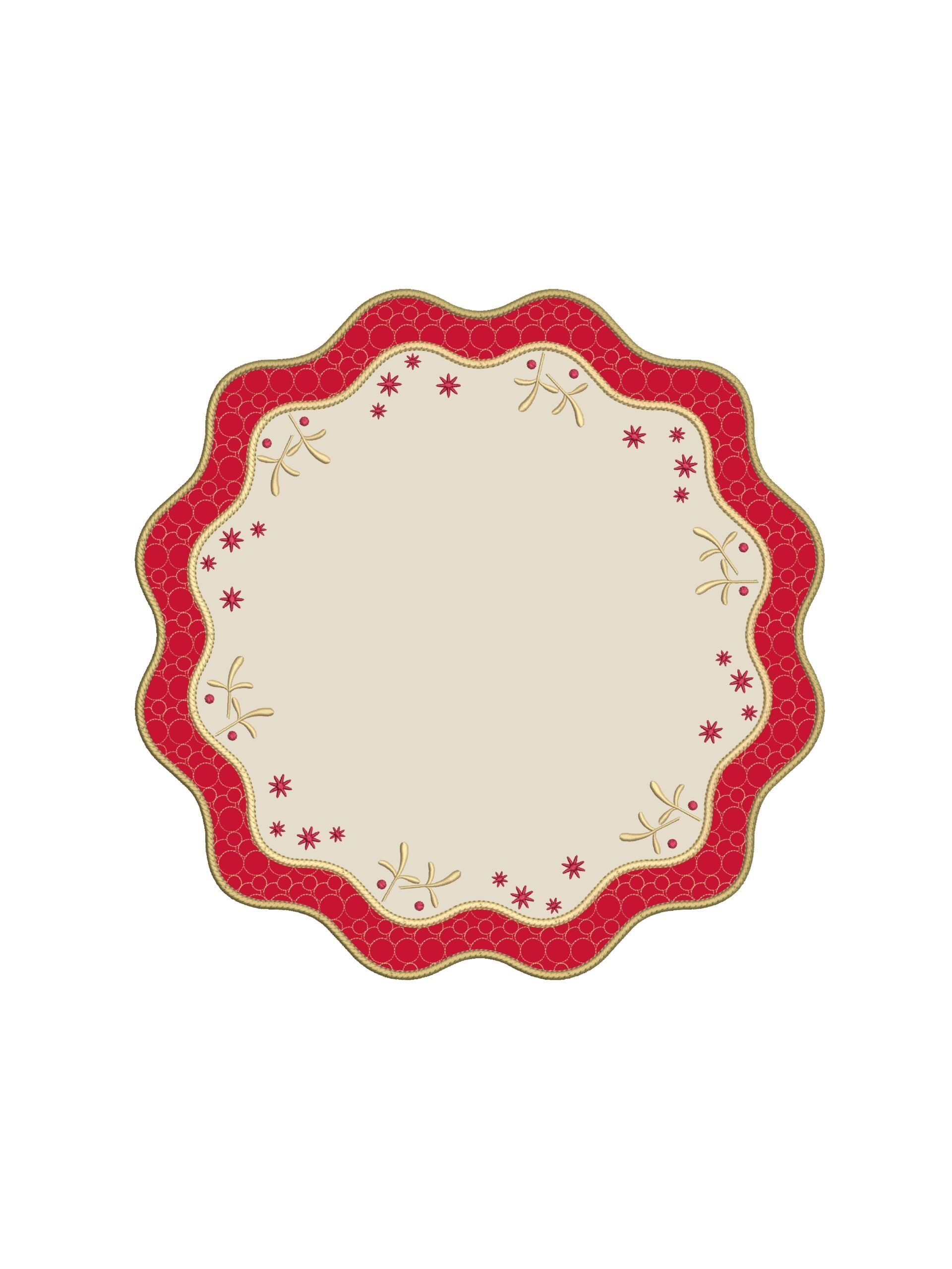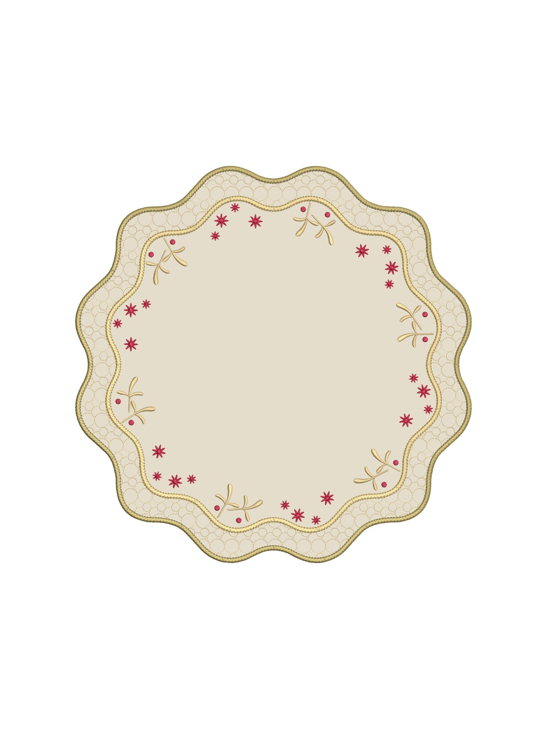 Мягкие волнообразные линии плейсматов и салфеток перекликаются с силуэтами традиционных новогодних украшений, а изящная вышивка со звёздами и зимними мотивами создаёт эффект лёгкой, праздничной графики.