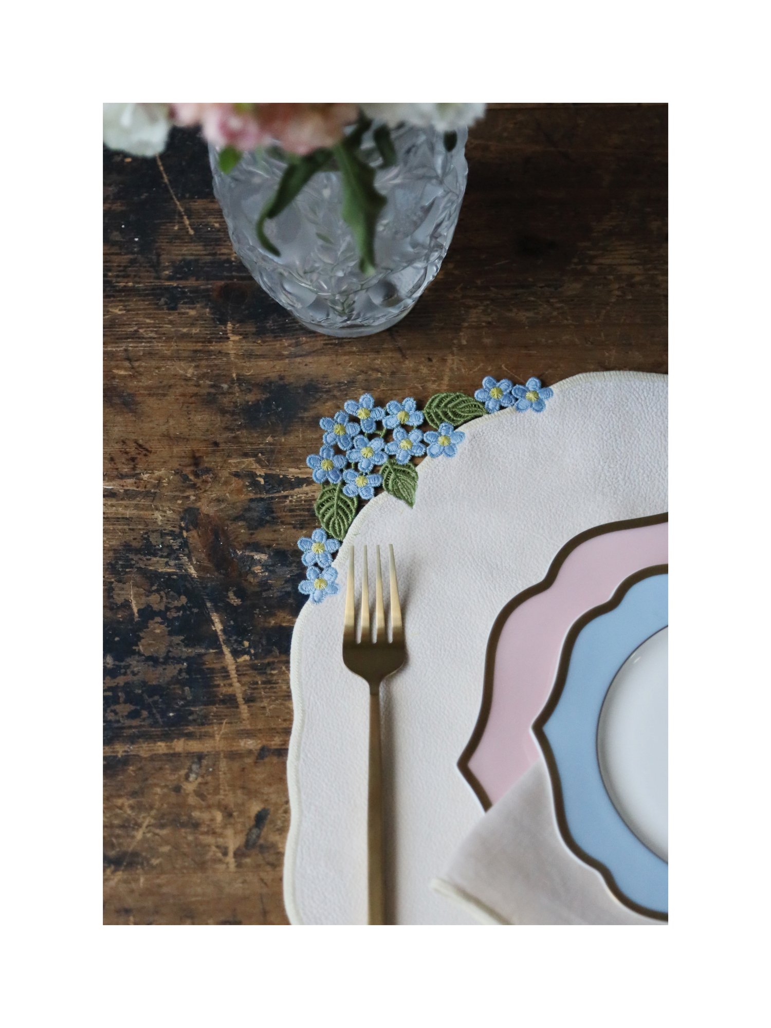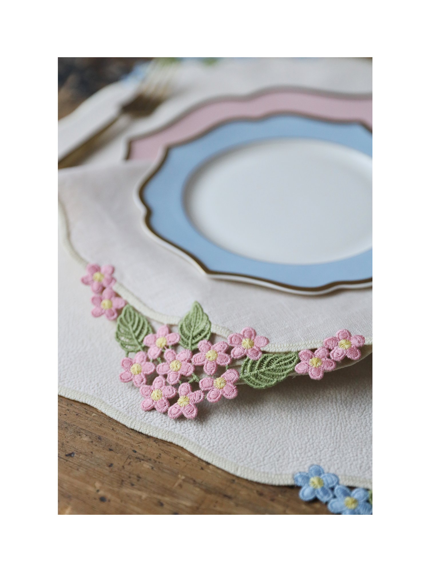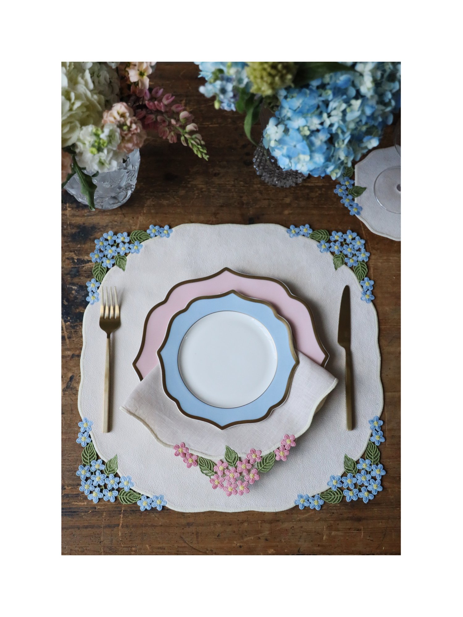Коллекция Reine du jardin переносит красоту цветущего сада в сервировку стола. Вышивка в виде соцветий гортензии раскрывается на ткани, словно крона растения, наполненная лёгким дыханием природы. Кружевное обрамление из тонких стеблей и листьев придаёт композиции изящество, а детальная проработка лепестков создаёт впечатление живого цветка.