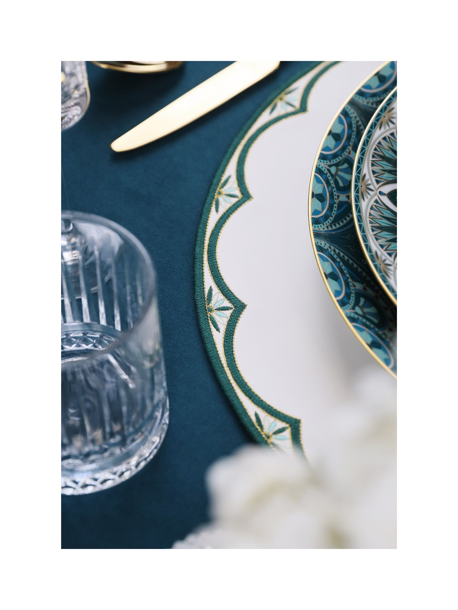 Как сны о Ниле, где вода отражает солнце и небеса, эта коллекция вобрала в себя дыхание древних садов и магию египетских символов. Тонкая вышивка, словно повторяющая ритм мозаик и росписей храмов, отсылает к знаменитому фарфору Haviland Rêves du Nil, где каждый орнамент — ода вечности и красоте.