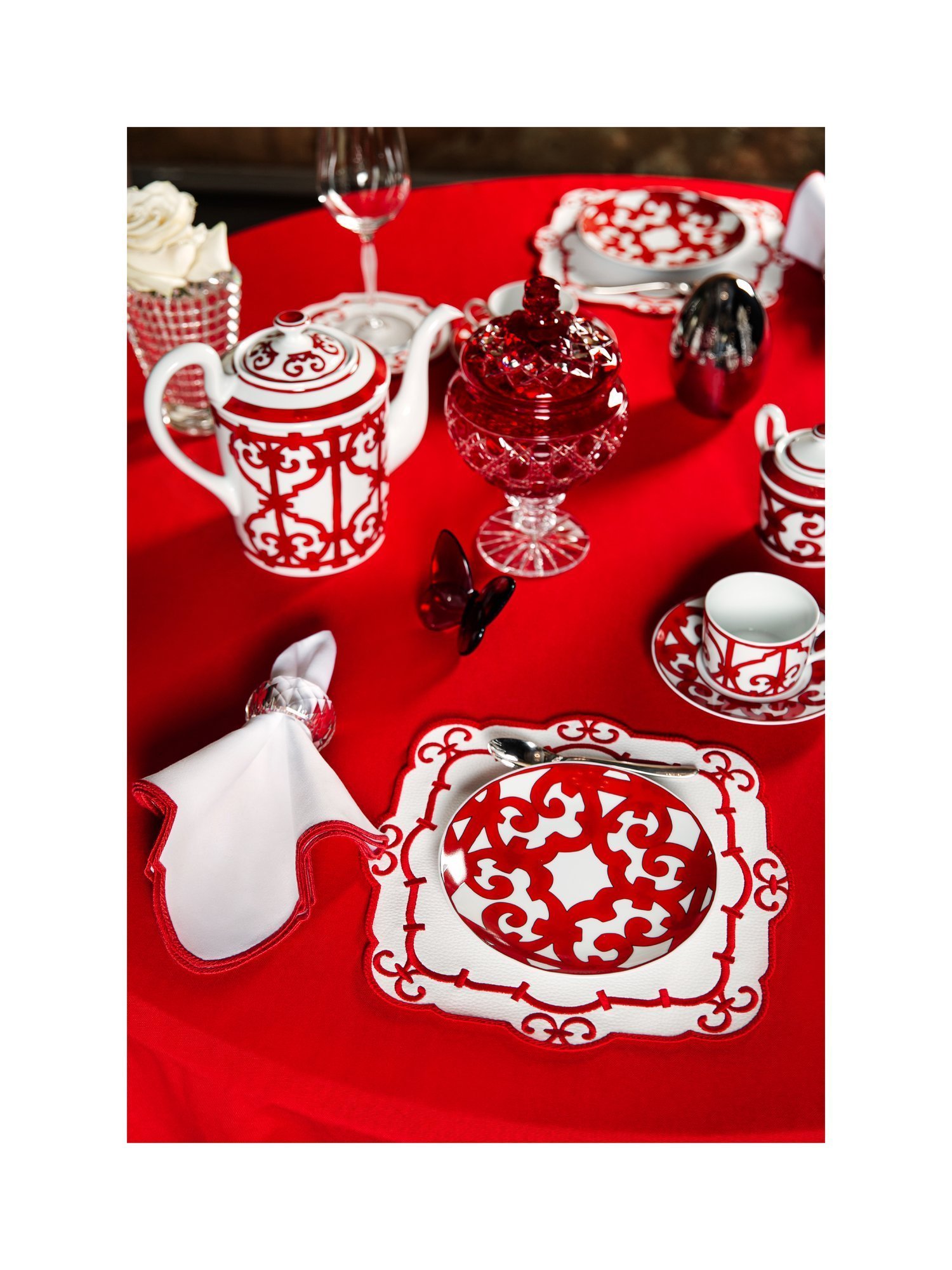 Коллекция Balcon — это переосмысление знаменитого орнамента Hermès Balcon du Guadalquivir, перенесённого из фарфора в ткань. Легендарный узор с изящными завитками и геометрией, напоминающей кованые балконы Андалусии, обретает новое звучание в текстиле. Здесь он становится не просто фоном, а самостоятельным акцентом, соединяющим эстетику Hermès и искусство сервировки.