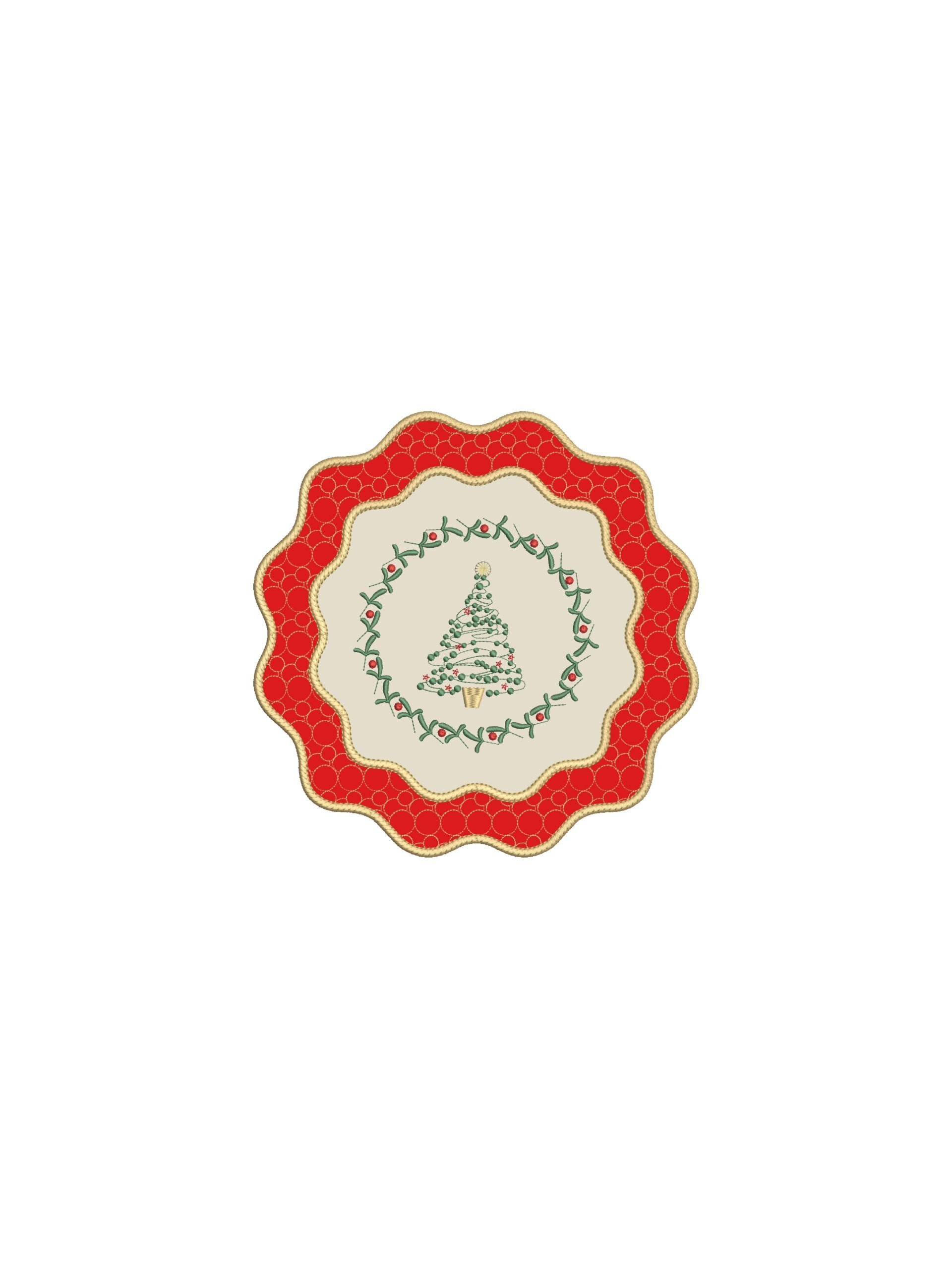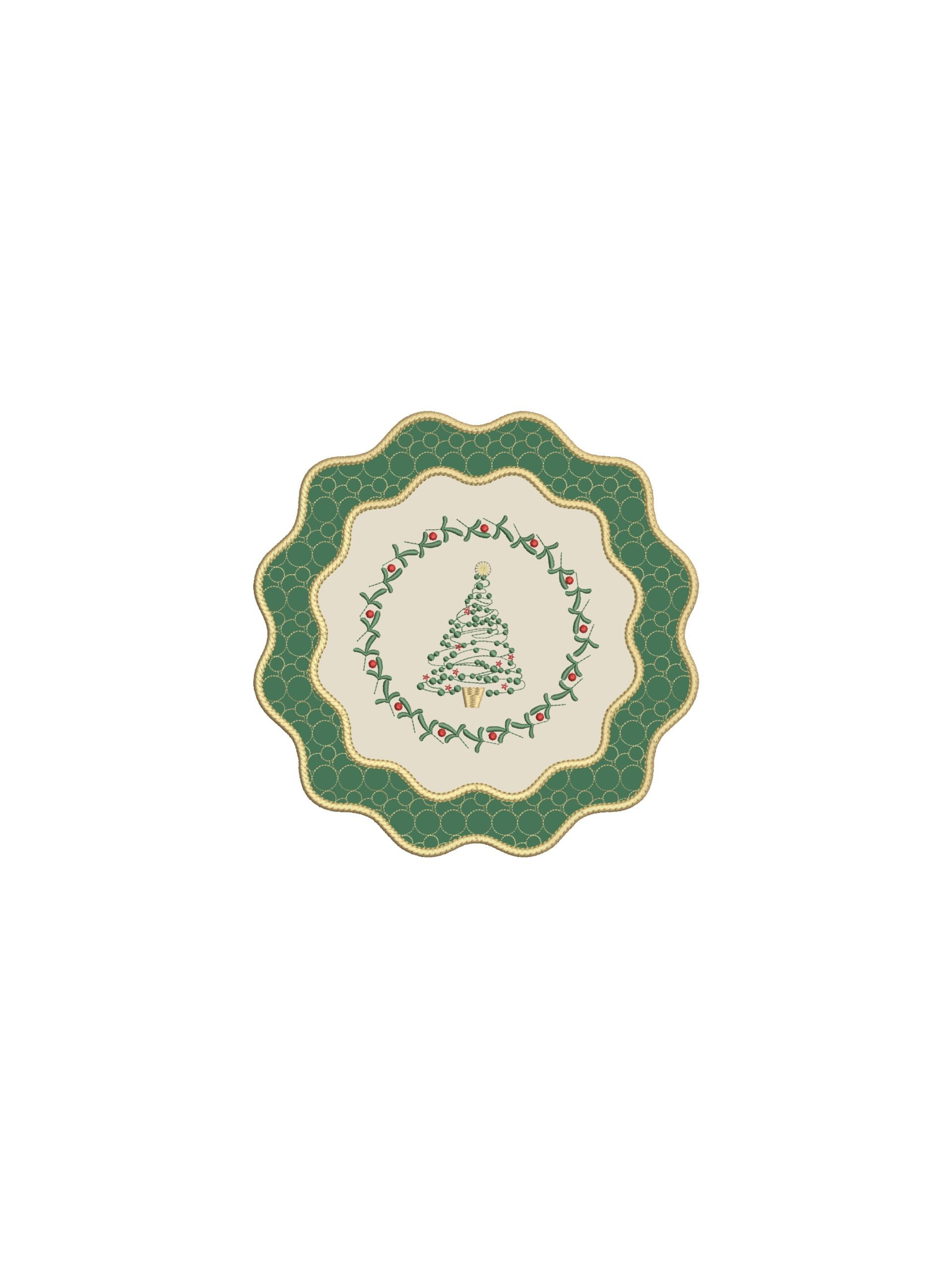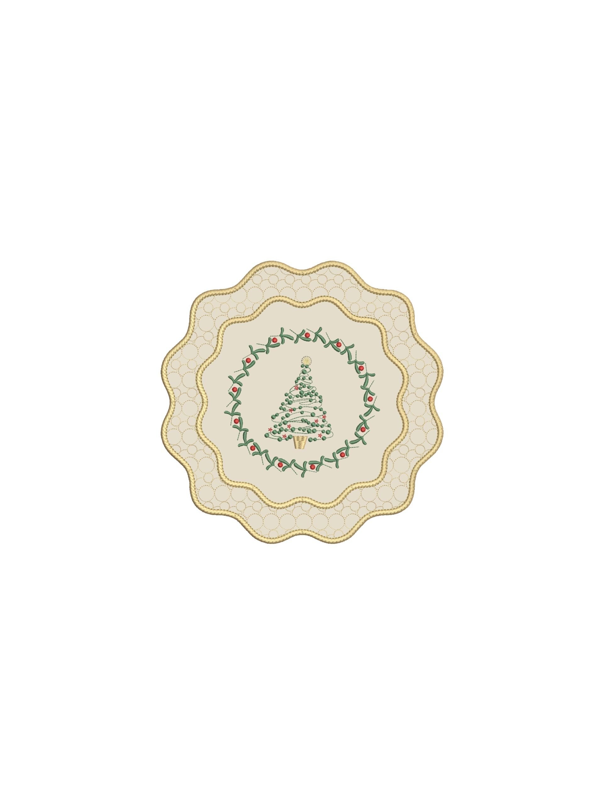 Мягкие волнообразные линии плейсматов и салфеток перекликаются с силуэтами традиционных новогодних украшений, а изящная вышивка со звёздами и зимними мотивами создаёт эффект лёгкой, праздничной графики.