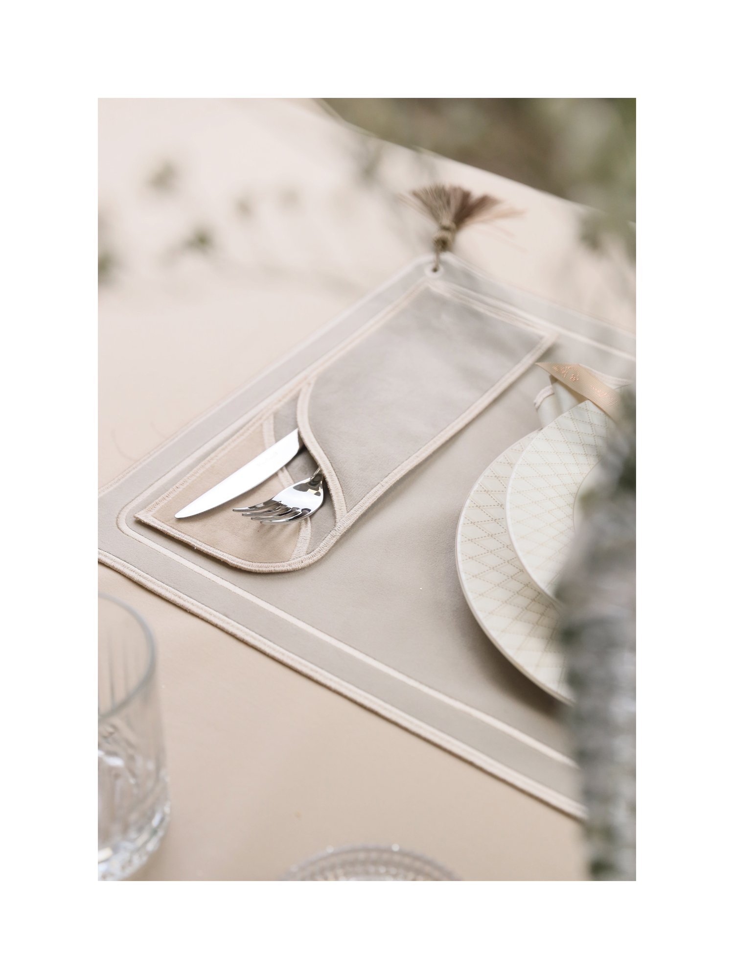 Коллекция Esthétique сочетает простоту линий и декоративную выразительность. Лёгкие кисточки на углах придают сервировке динамику и изысканный характер, а конверт для приборов завершает образ, создавая ощущение продуманной гармонии.