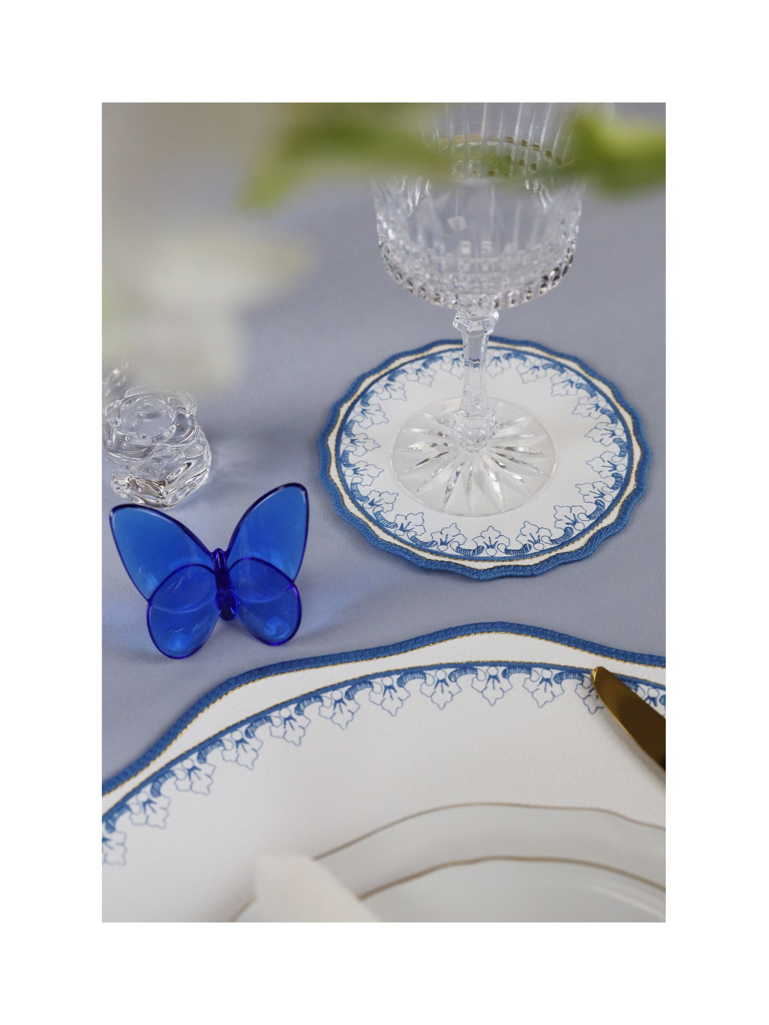 Коллекция Butterfly Bloom подобна тонкой акварели на ткани. Бабочка, застигнутая в невесомом полёте над цветком, отсылает к изящным китайским мотивам, где каждый штрих хранит гармонию природы. Узор по краю лишь подчеркивает эту воздушную композицию, словно лёгкая рама для живой миниатюры.