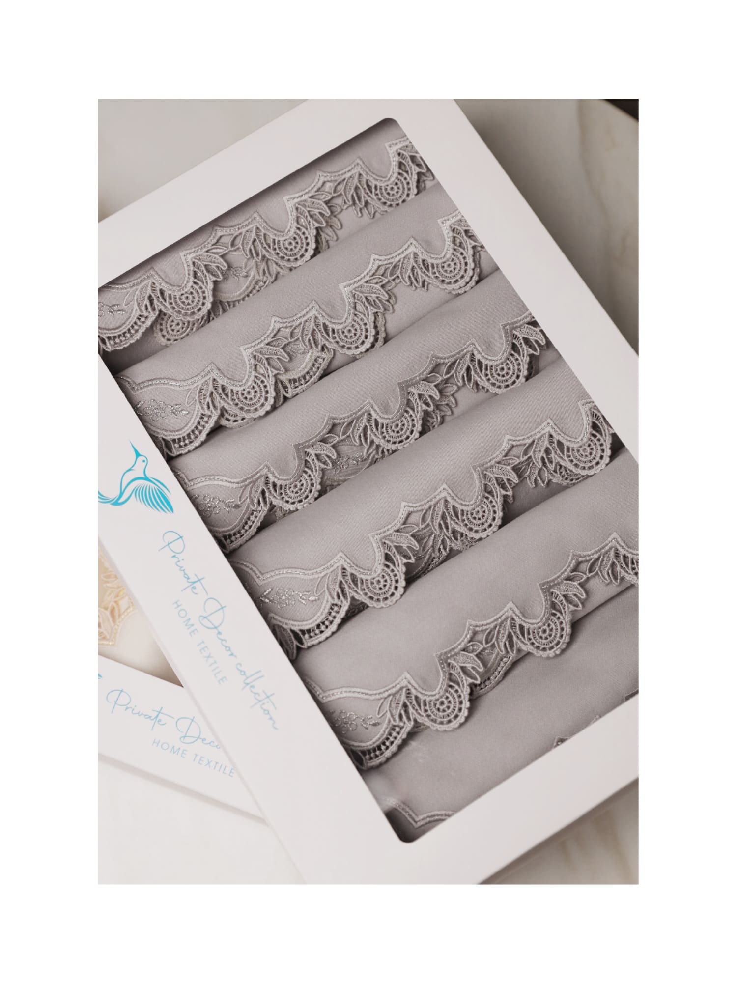 Ажурный край, выполненный в технике ришелье, формирует изящный силуэт, напоминающий тонкие воротнички старинных придворных нарядов. Его плавные линии и вырезные элементы создают эффект лёгкого кружева, который мягко очерчивает форму салфеток и плейсматов.