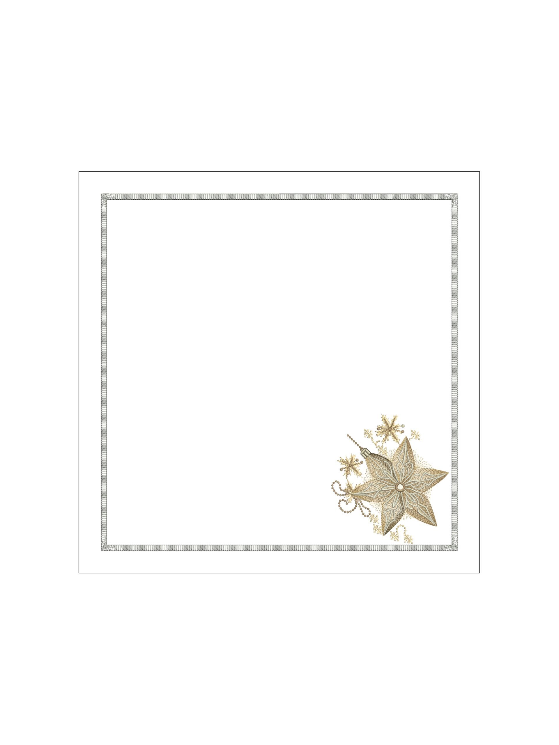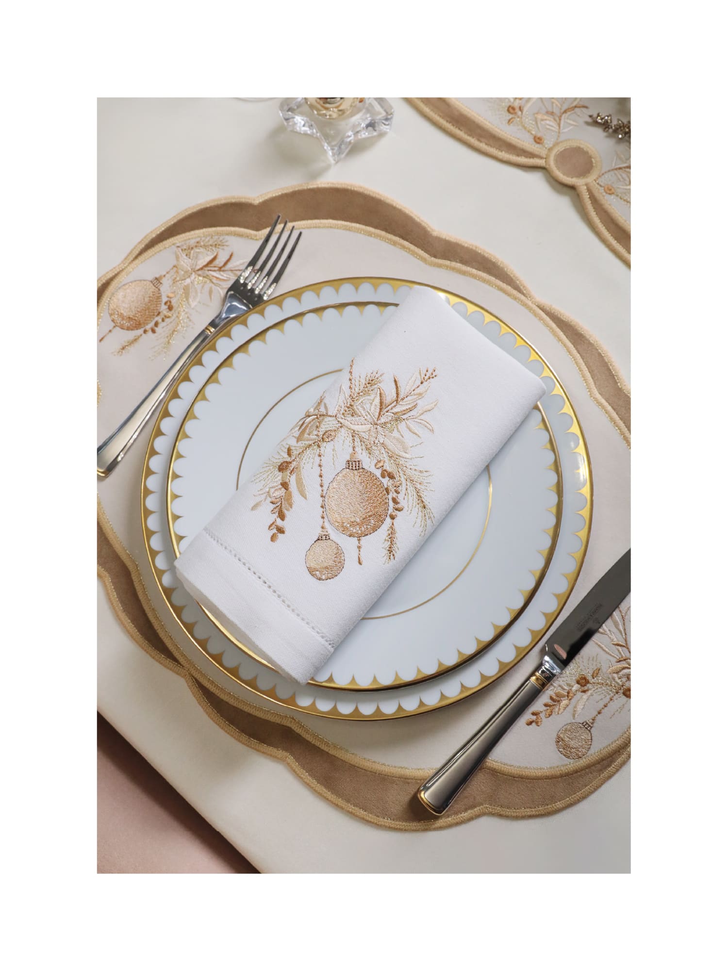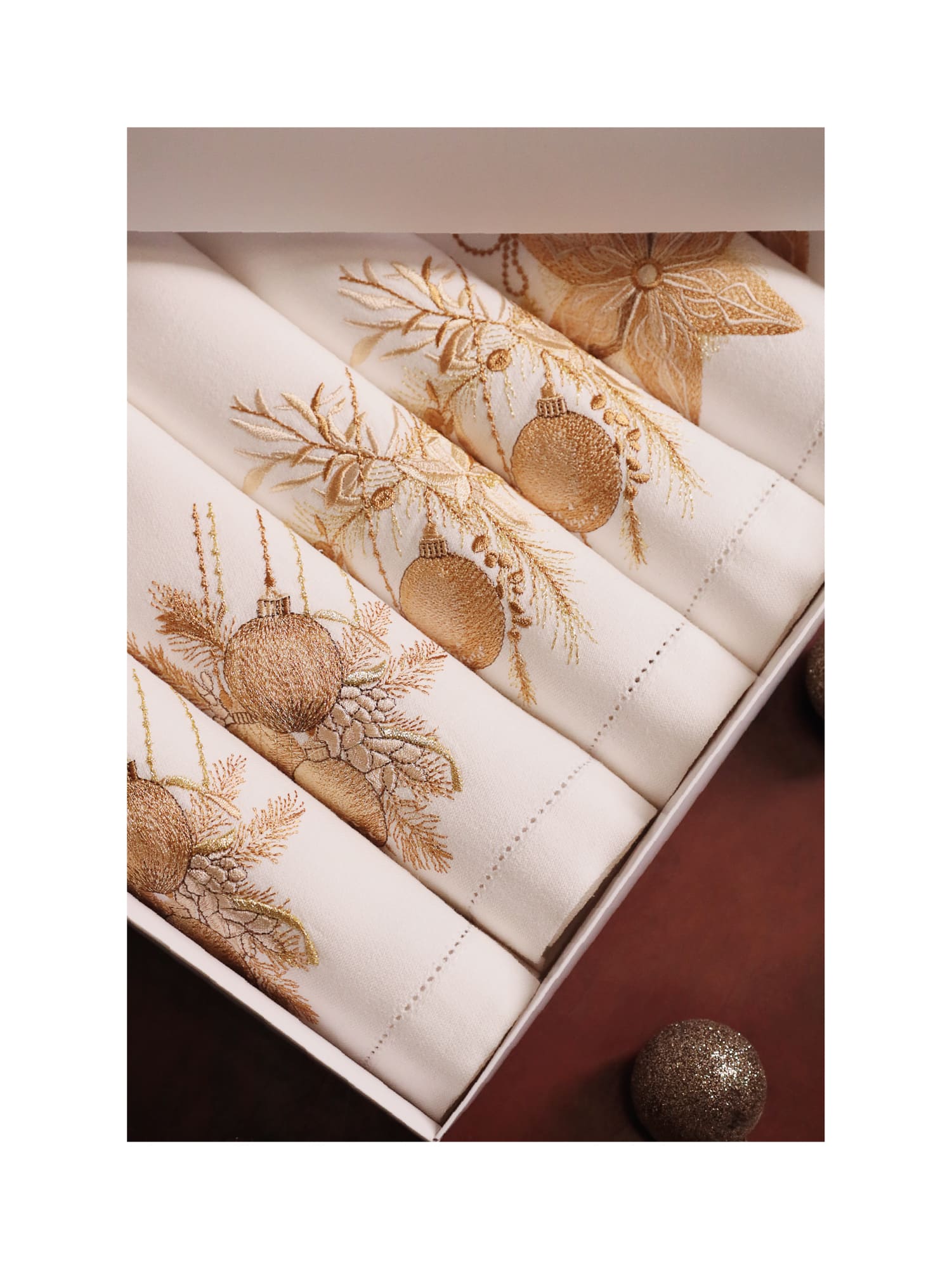 Тонкая вышивка с новогодними шарами, еловыми ветвями и деликатными снежинками выполнена в благородных золотистых оттенках, словно отражающих мягкий свет свечей и хрусталь на праздничном столе. Каждая салфетка создает ощущение торжественной лёгкости, когда украшения не перегружают, а возвышают сервировку.
