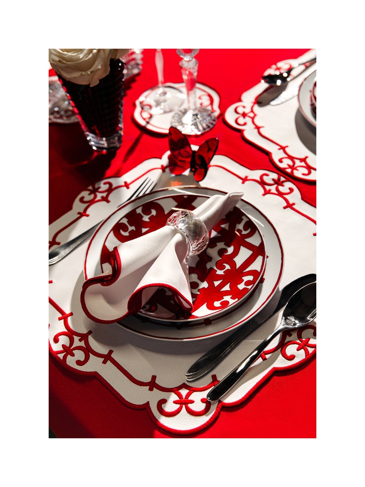 Коллекция Balcon — это переосмысление знаменитого орнамента Hermès Balcon du Guadalquivir, перенесённого из фарфора в ткань. Легендарный узор с изящными завитками и геометрией, напоминающей кованые балконы Андалусии, обретает новое звучание в текстиле. Здесь он становится не просто фоном, а самостоятельным акцентом, соединяющим эстетику Hermès и искусство сервировки.