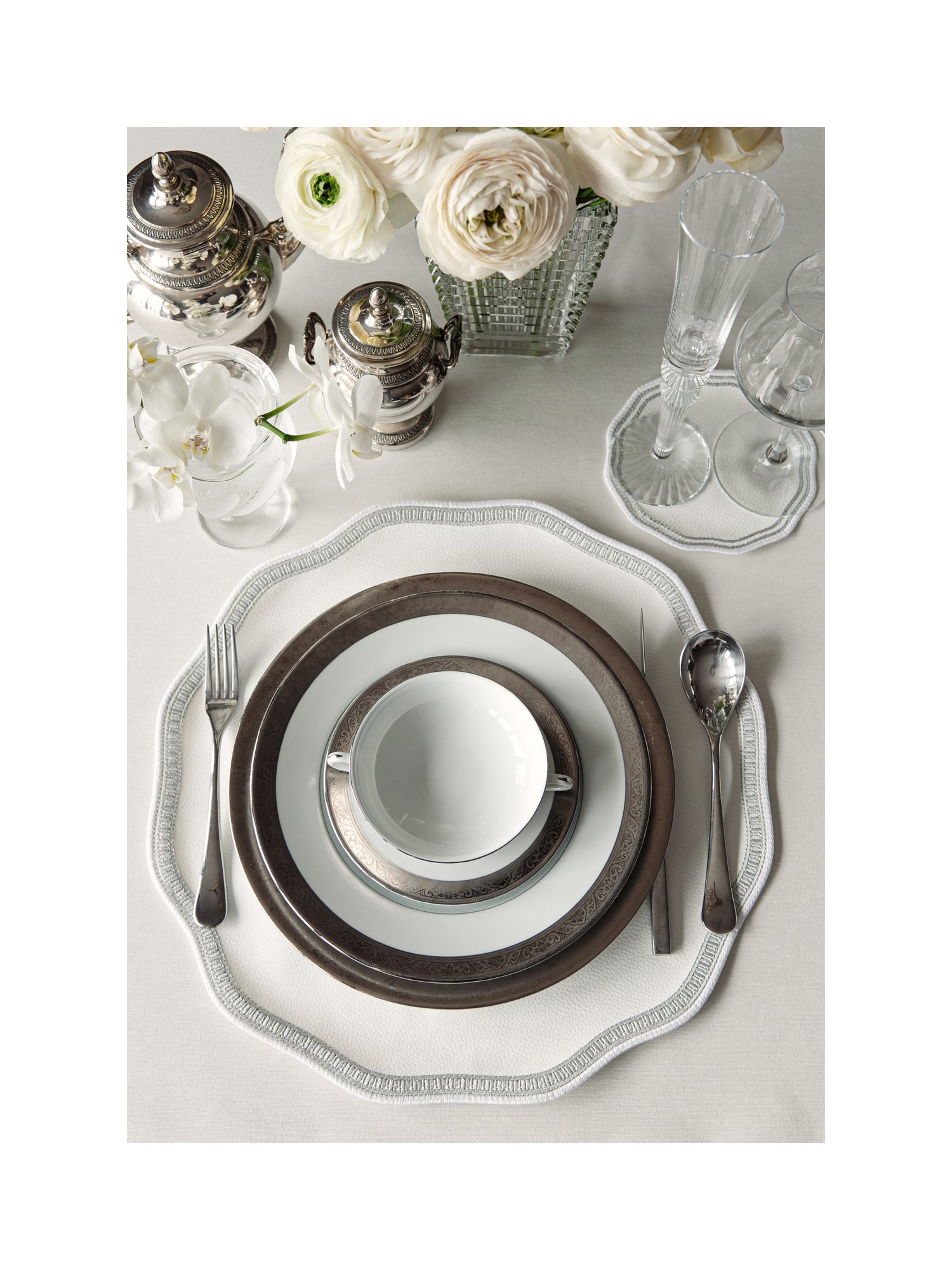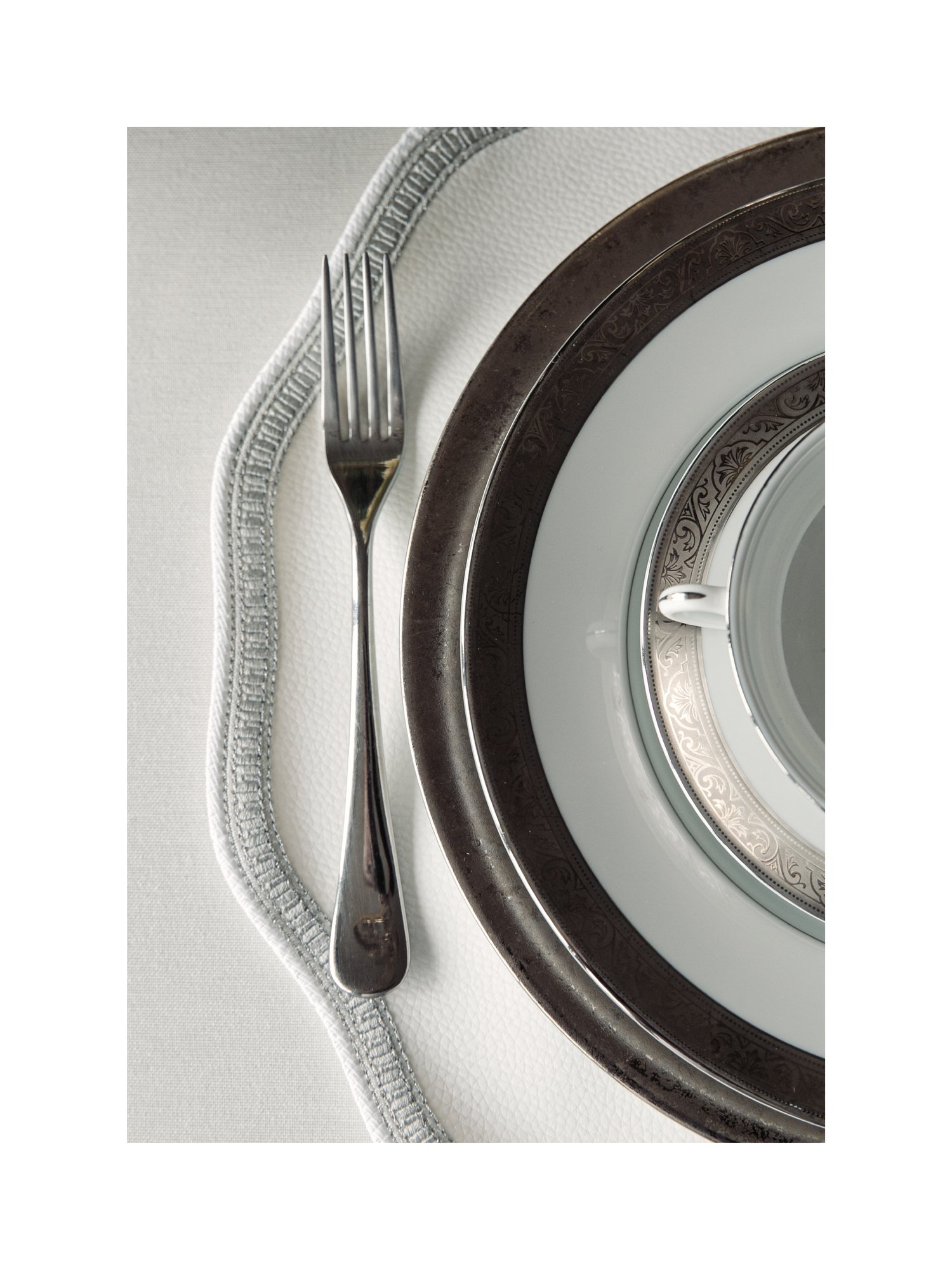 Empire — коллекция, в которой геометрия приобретает мягкость. Чёткий силуэт обрамлён плавными волнами, создающими игру ритма и симметрии. Тонкая серебряная вышивка подчёркивает форму, превращая её в изысканный графический акцент. Дизайн, где архитектурная строгость соединяется с лёгкой декоративностью, наполняя стол утончённой гармонией.