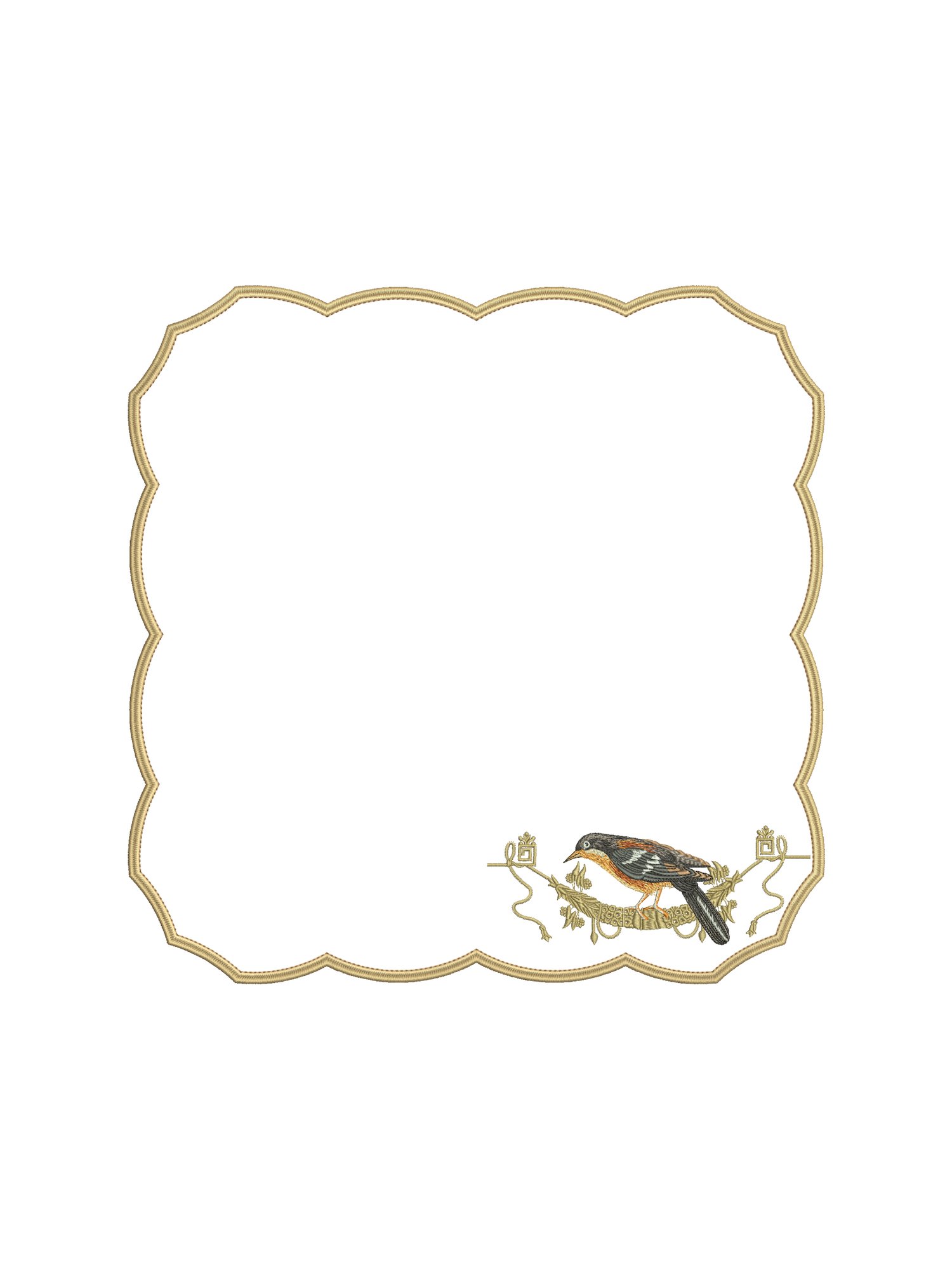 Тонкая вышивка вручную передаёт утончённые детали оперения лесных птиц: глубокие синие и изумрудные оттенки переплетаются с золотыми акцентами, создавая впечатление живой миниатюры.