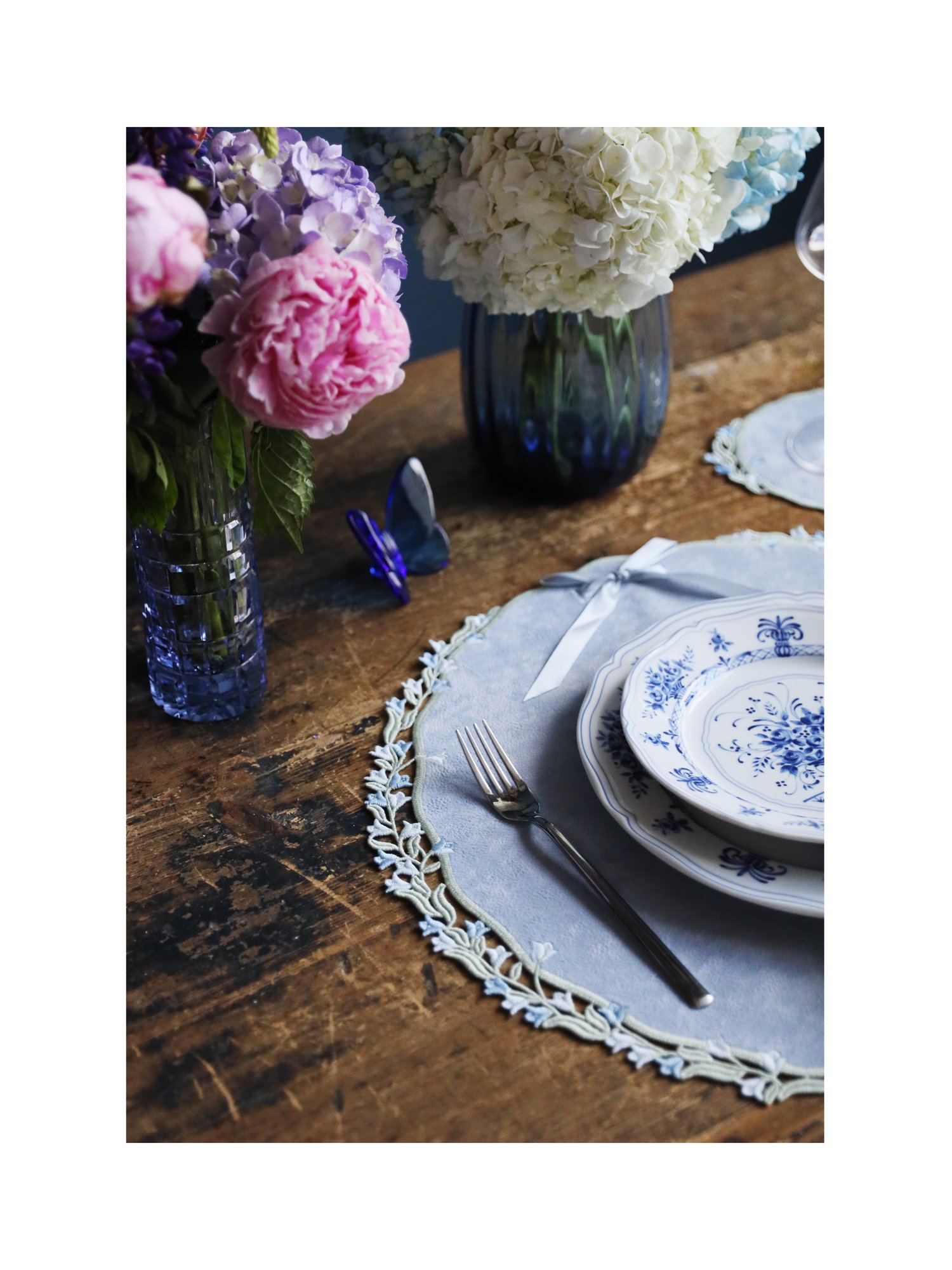 Коллекция Mille Fleurs вдохновлена образом цветущих колокольчиков. Их тонкие стебли и изящные бутоны образуют по краю изысканный кружевной орнамент, создающий впечатление лёгкого венка из живых цветов. Мягкие линии форм и филигранная вышивка передают нежность и изящество природного мотива, превращая изделия в утончённый акцент для сервировки.