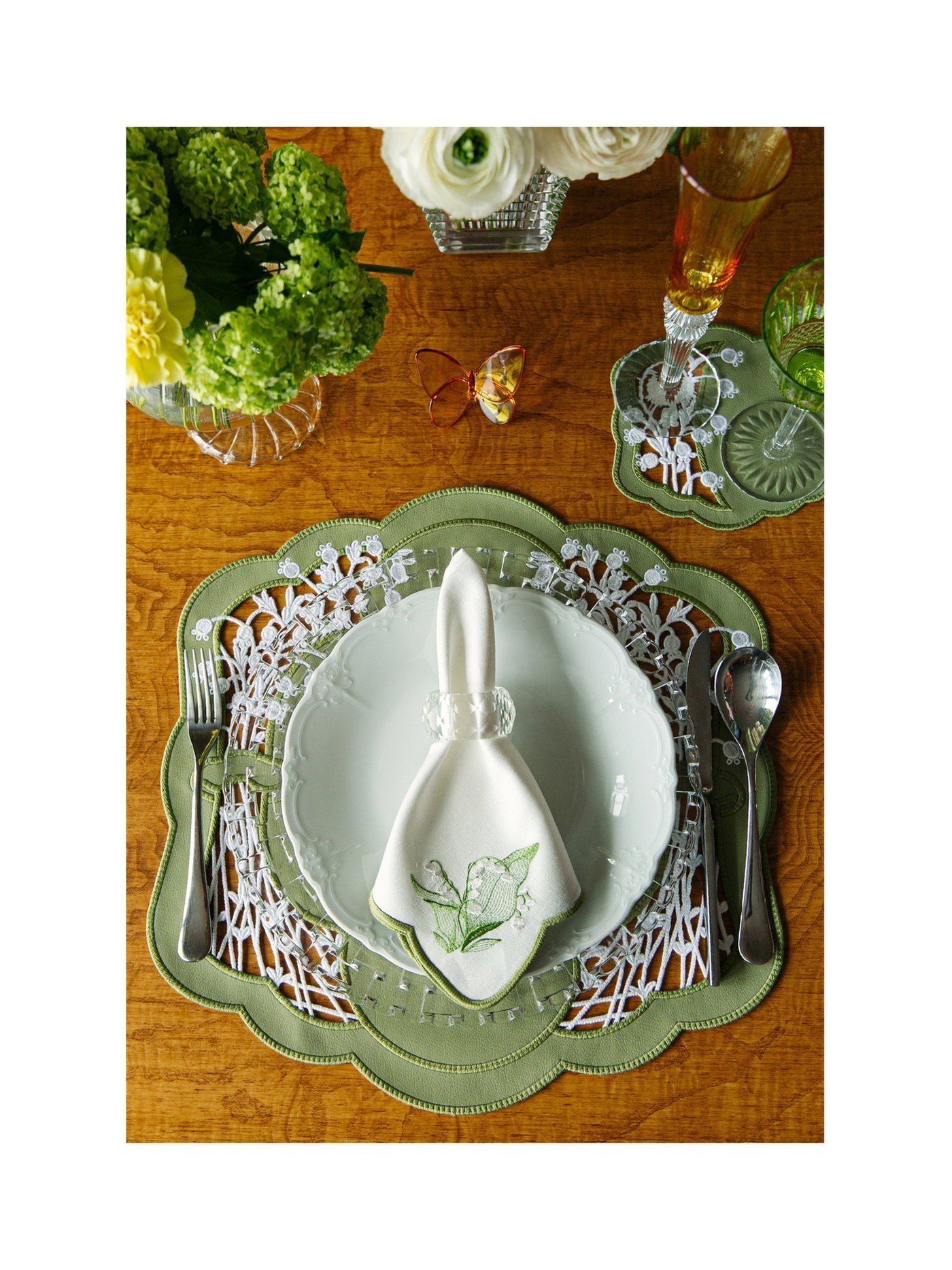Коллекция Spring Flowers вдохновлена трогательной красотой первых весенних цветов. Изделия украшают изящные ландыши, выполненные в технике тонкой вышивки и ажурного декора. Легкий орнамент образует графичную, почти кружевную композицию, создающую ощущение свежести и обновления.