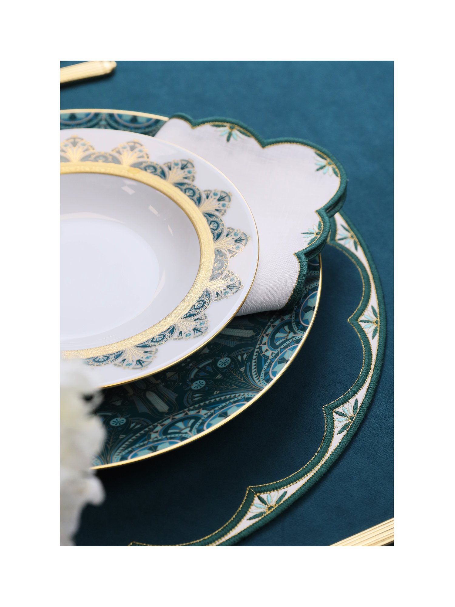 Как сны о Ниле, где вода отражает солнце и небеса, эта коллекция вобрала в себя дыхание древних садов и магию египетских символов. Тонкая вышивка, словно повторяющая ритм мозаик и росписей храмов, отсылает к знаменитому фарфору Haviland Rêves du Nil, где каждый орнамент — ода вечности и красоте.