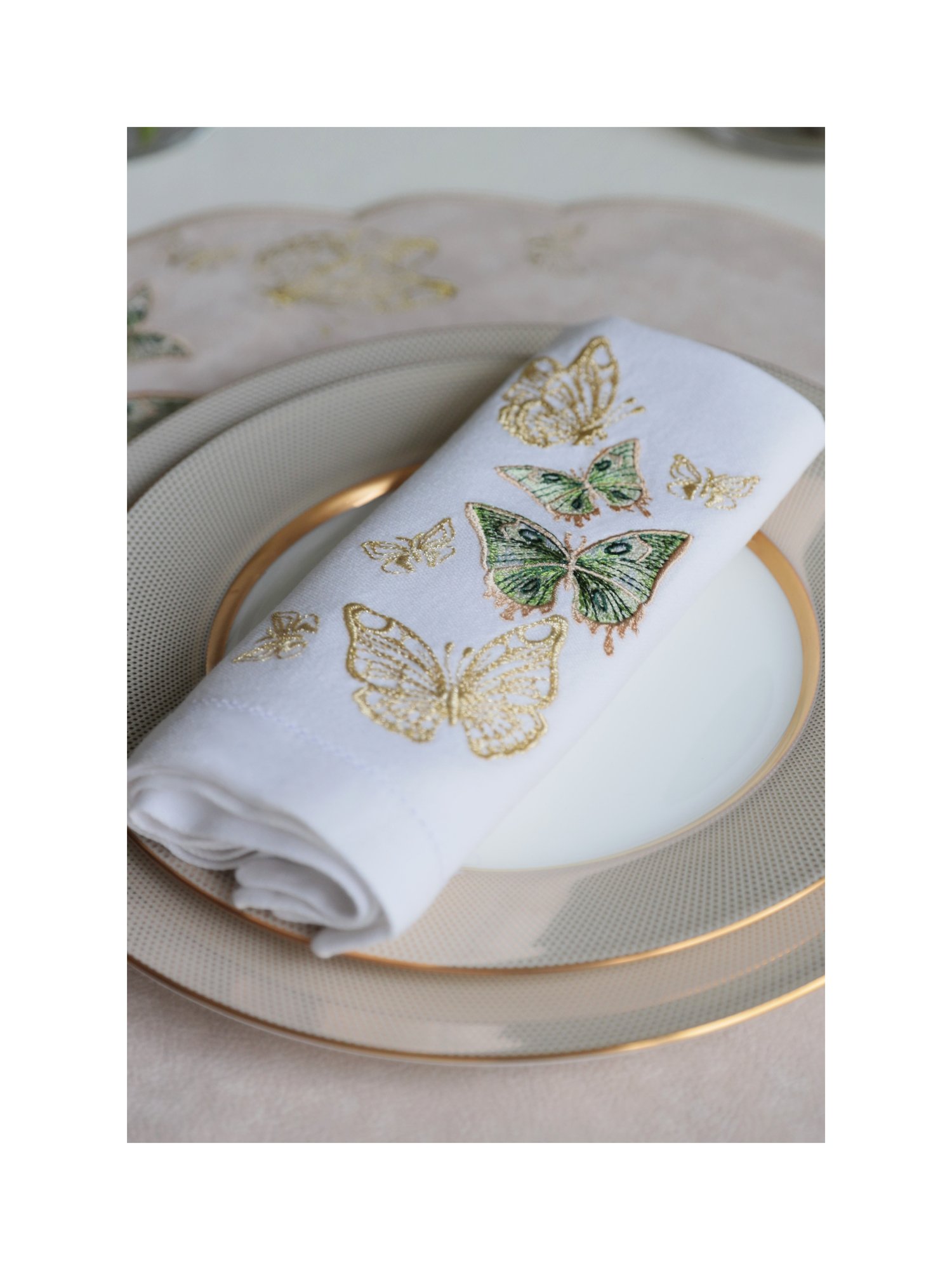 Коллекция Feerie хранит в себе магию природы. Бабочки, вышитые тонкими золотыми и зелёными нитями, кажутся живыми — будто они только что коснулись ткани крыльями. Лёгкие контуры и изящные формы превращают сервировку в сказочный сюжет, где красота раскрывается в каждом движении и детали.